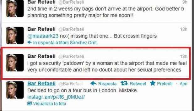 ROMA – “Ho ricevuto una ‘perquisizione personale’ durante un controllo di sicurezza all’aeroporto da una donna che mi ha messo veramente a disagio e non mi ha lasciato dubbi sulle sue preferenze sessuali”: parola della supermodella israeliana Bar Rafaeli, che si è sfogata con un messaggio su Twitter.