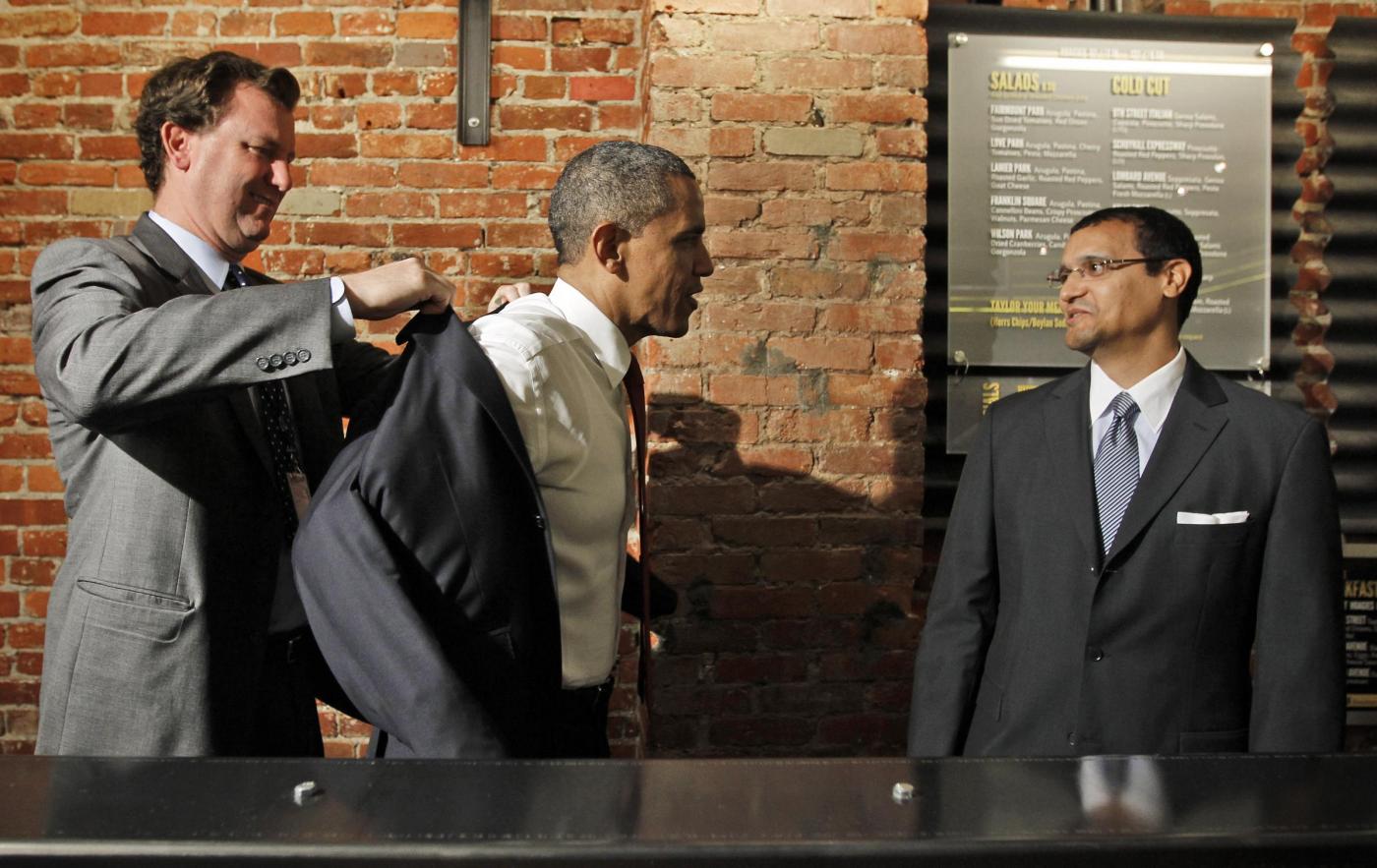 President Barack Obama receives help putting on his suit jacket by his personal assistant Marvin Nicholson, left, for a photograph with Brian J. Smith, right, Founding Principle of Francis Lee Contracting, after a meeting with local small business owners at Taylor Gourmet in the U Street neighborhood in Washington, Wednesday, May 16, 2012. (AP Photo/Pablo Martinez Monsivais)