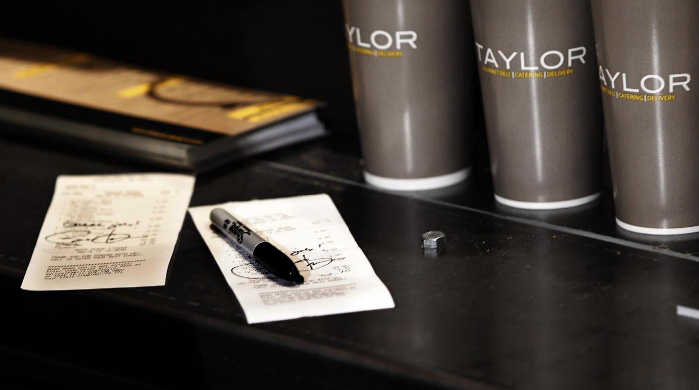 President Barack Obama's signed receipts sit at the counter after Obama order hoagies sandwiches following his meeting with local small business owners at Taylor Gourmet in the U Street neighborhood in Washington, Wednesday, May 16, 2012. (AP Photo/Pablo Martinez Monsivais)