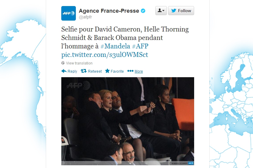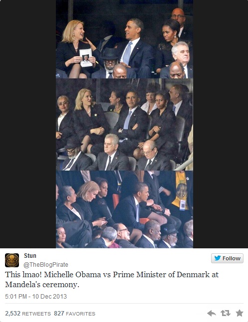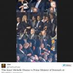 PRETORIA – Un selfie – un autoscatto – di Obama con Cameron e la premier danese Helle Thorning-Schmidt scattata alla cerimonia in onore di Nelson Mandela a Pretoria, in Sud Africa, ha avuto l’effetto di far ingelosire Michelle Obama. Nella foto si vede come la moglie del presidente americano sia decisamente poco colpita e alquanto irritata dal fatto che il marito sia un po troppo vicino alla premier danese.