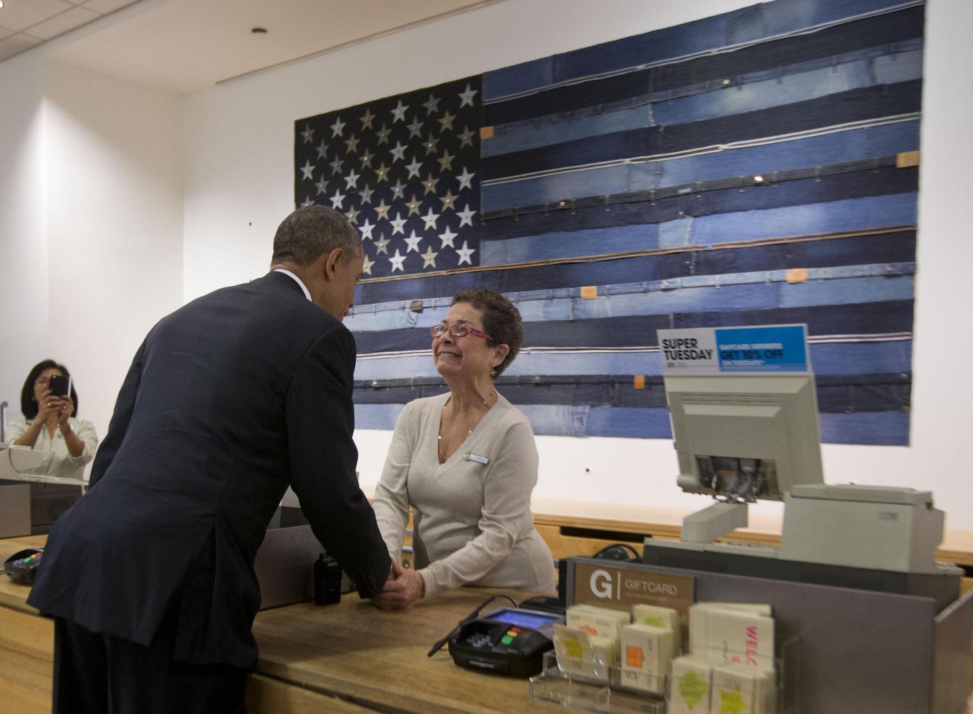 President Barack Obama greets cashier Sonia Del Gatto at a GAP clothing store in Manhattan during his unannounced shopping visit, Tuesday, March 11, 2014. Obama used the visit to talk about raising the minimum hourly wage standards and applauded the GAP, who earlier in the year announced it was raising minimum wage for its employees. (AP Photo/Pablo Martinez Monsivais)