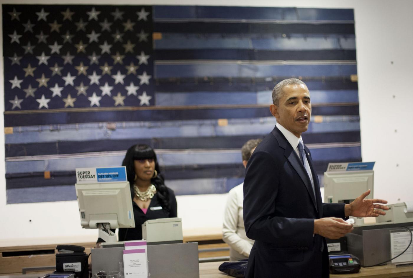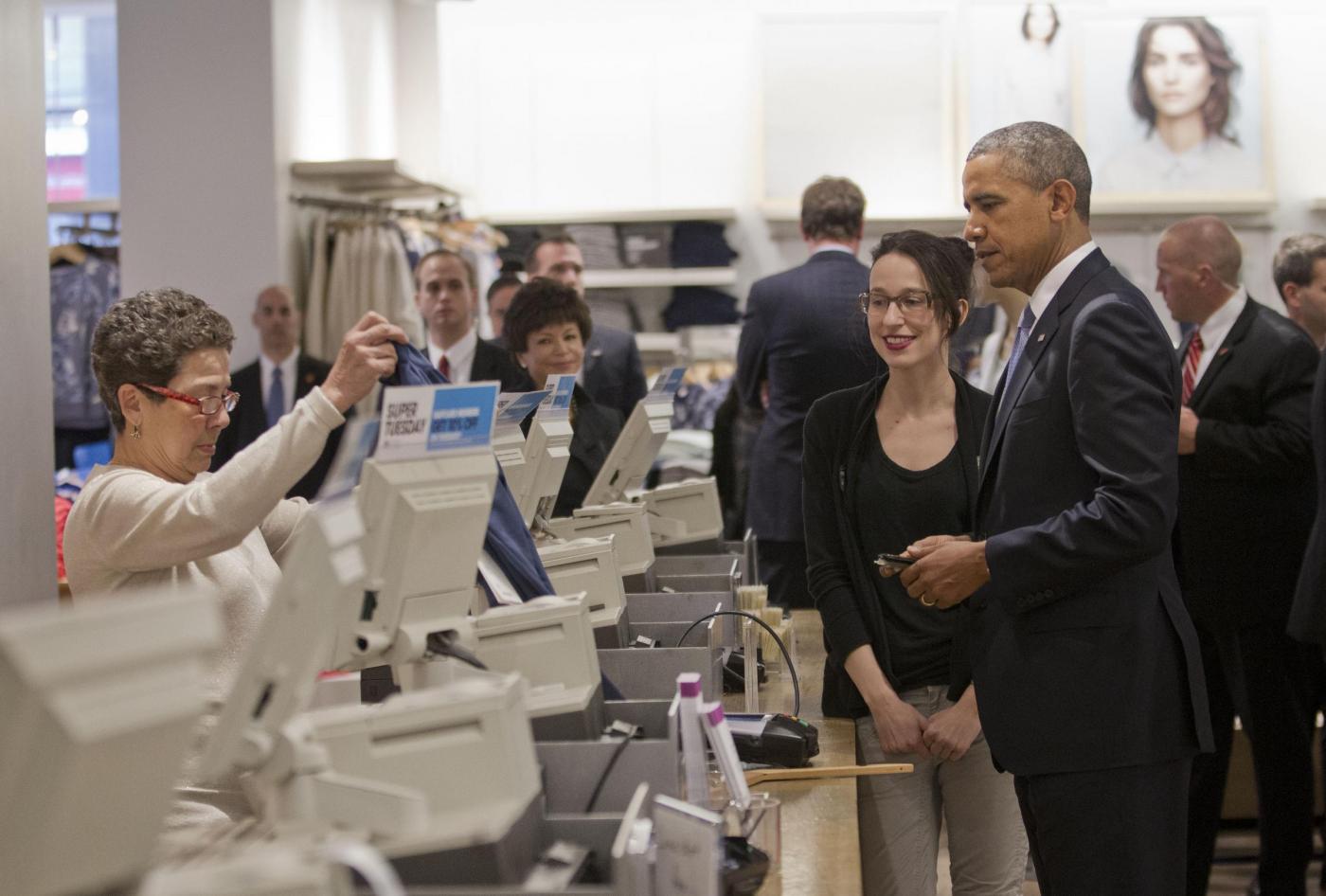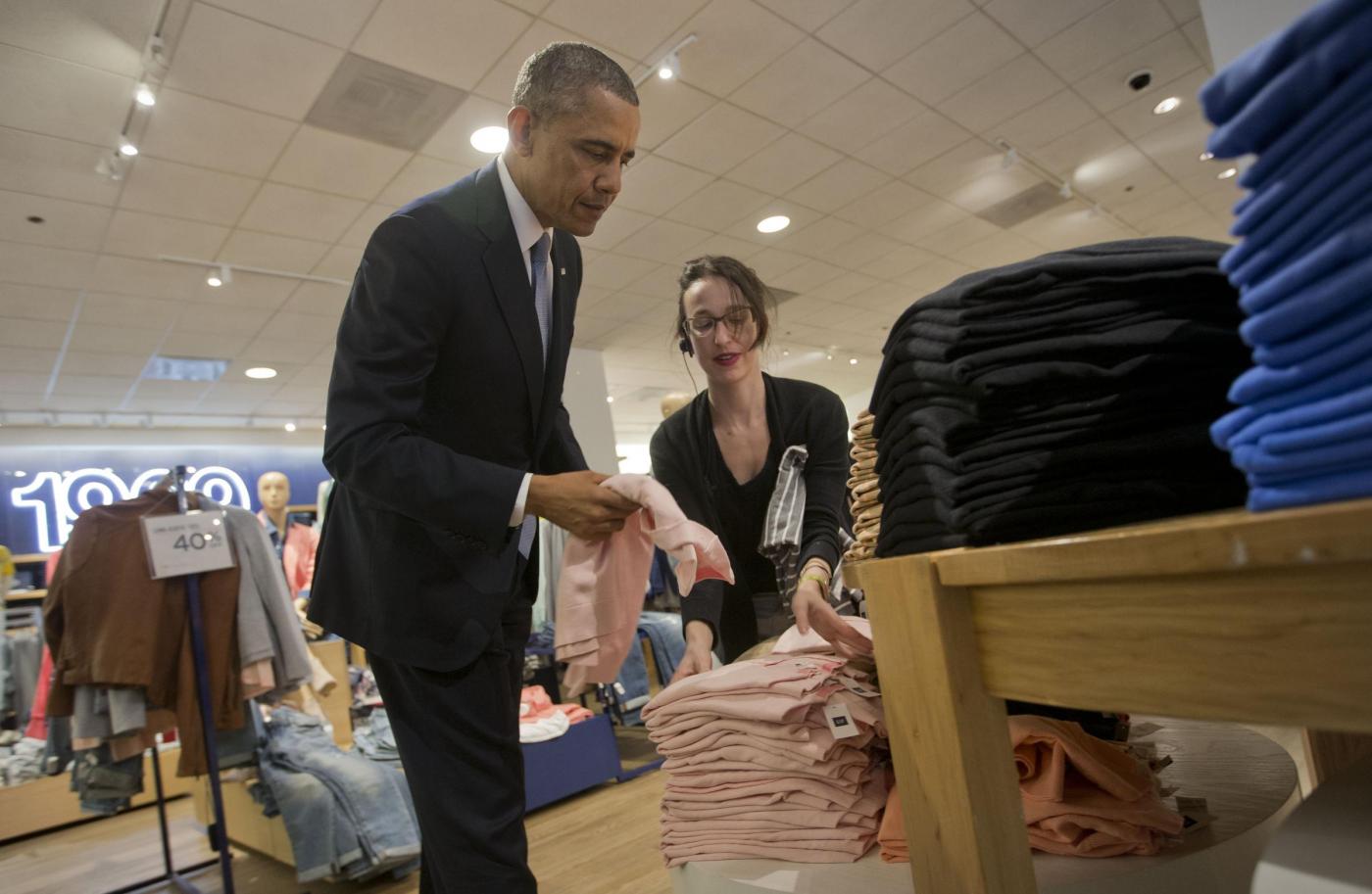 NEW YORK – Barack Obama si presenta in un negozio Gap di Manhattan per acquistare felpe e magliette per la sua famiglia. Il presidente ha spiegato che la sua visita era anche un modo per sostenere l’iniziativa di questa catena che ha annunciato di voler aumentare il solario minimo dei suoi lavoratori.