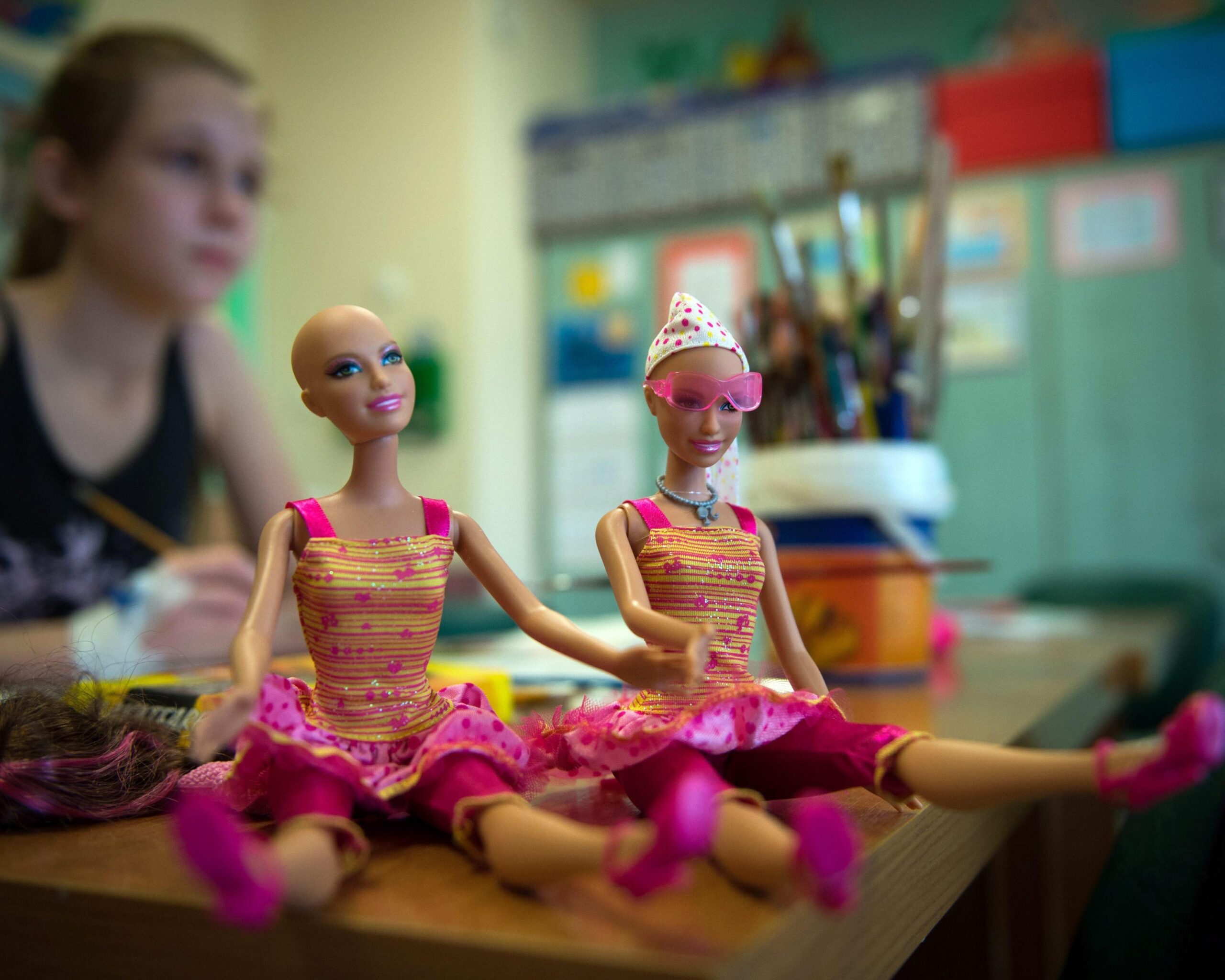 epa03792939 A child plays with two of twelve bald Barbie dolls in Jurasz University Hospital in Bydgoszcz, Poland, 19 July 2013. The Jurasz Hospital is the only one in Poland where children after chemotherapy can play with specially designed Barbie dolls. The Mattel company created the bald dolls for young patients who have lost their hair due to cancer treatments or other medical reasons. The dolls are not for sale at retail stores. EPA/TYTUS ZMIJEWSKI POLAND OUT