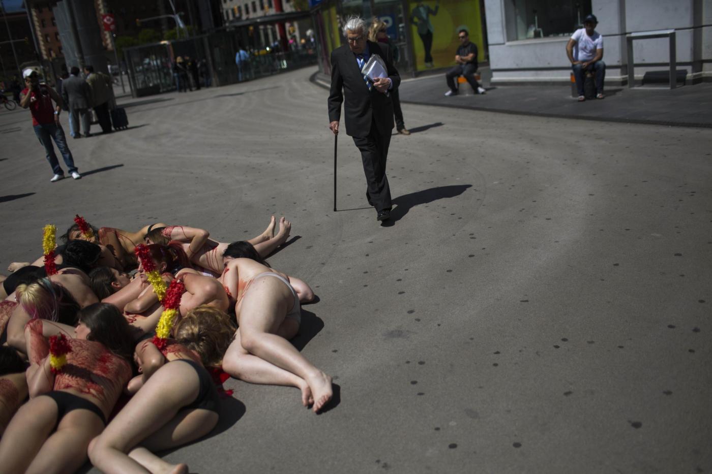 BARCELLONA – Alcune attiviste anti-corride si sono sdraiate nude in strada a Barcellona. Una delle ragazze porta in mano un cartello con su scritto “torture is not culture”.