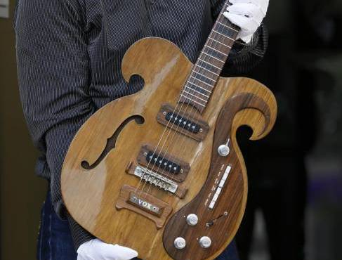 Darren Julien, President and CEO of Julien's Auctions holds a custom made prototype VOX guitar played by George Harrison and John Lennon during The Beatles 1967 Magical Mystery Tour, in London, Thursday, May 9, 2013. The rare guitar will go on display Thursday in a London hotel where fans can see it before it is auctioned in New York on Saturday May 18, and expected to sell for $200,000-$300,000 (128,000-193,000 pounds) (AP Photo/Kirsty Wigglesworth)