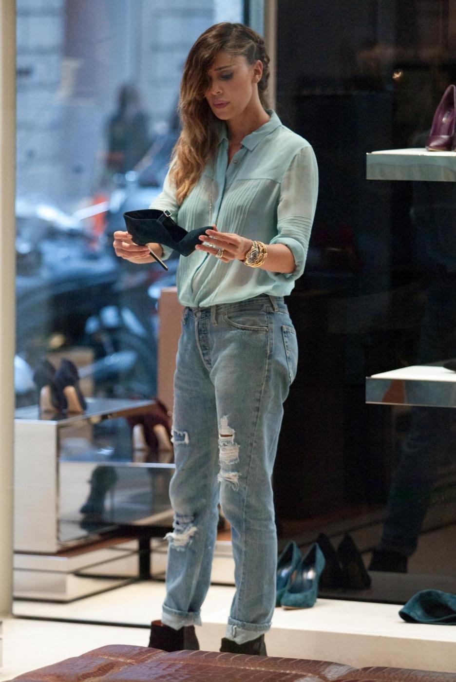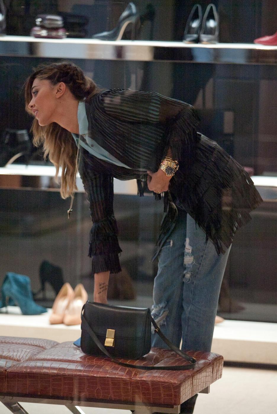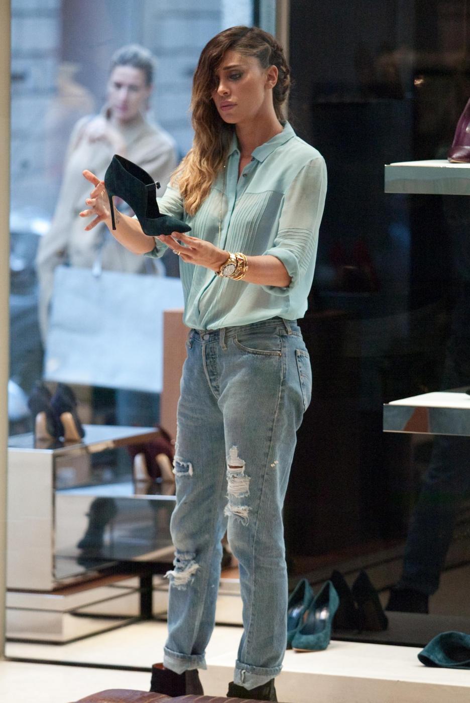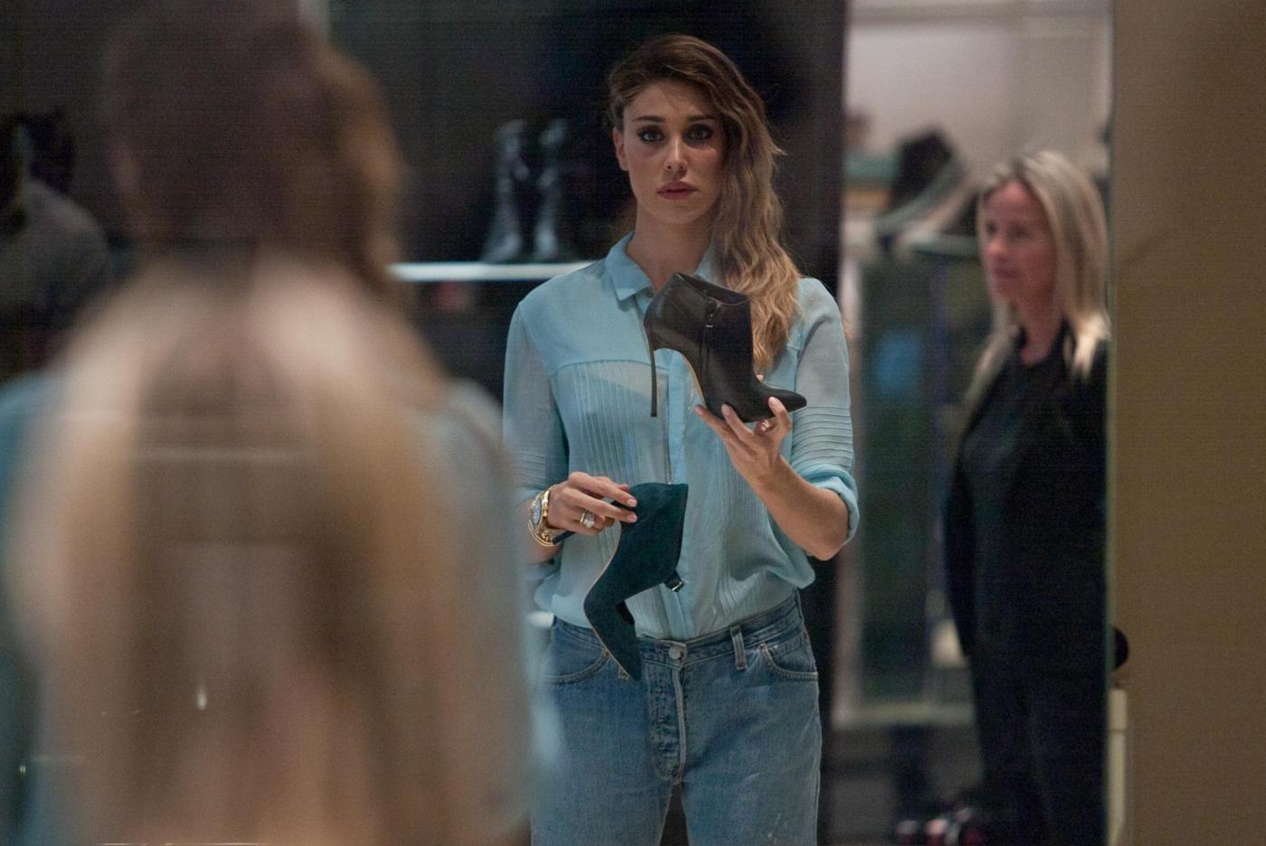 Belen è indecisa tra quale stivaletto acquistare: la modella e presentatrice, indossa jeans strappati e camicia che non nasconde il reggiseno nero. I suoi capelli sono intrecciati da una parte. Ad un certo punto si china a provare le scarpe e concede ai suoi fan delle pose decisamente sexy.