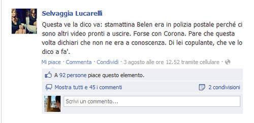 A comunicare l’esistenza di questi filmati a luci rosse è stata nuovamente Selvaggia Lucarelli sul suo profilo Twitter. La blogger ha scritto: “Belen era alla polizia postale per denunciare la messa in rete di altri film hard”. Questa volta però, Belen non apparirebbe inesperta e probabilmente in giovane età come fu per il video girato con l’ex in Argentina: si tratterebbe, sempre secondo quanto scrivono i siti, di video recenti registrati in compagnia dell’ex re dei paparazzi.
