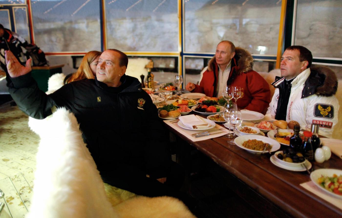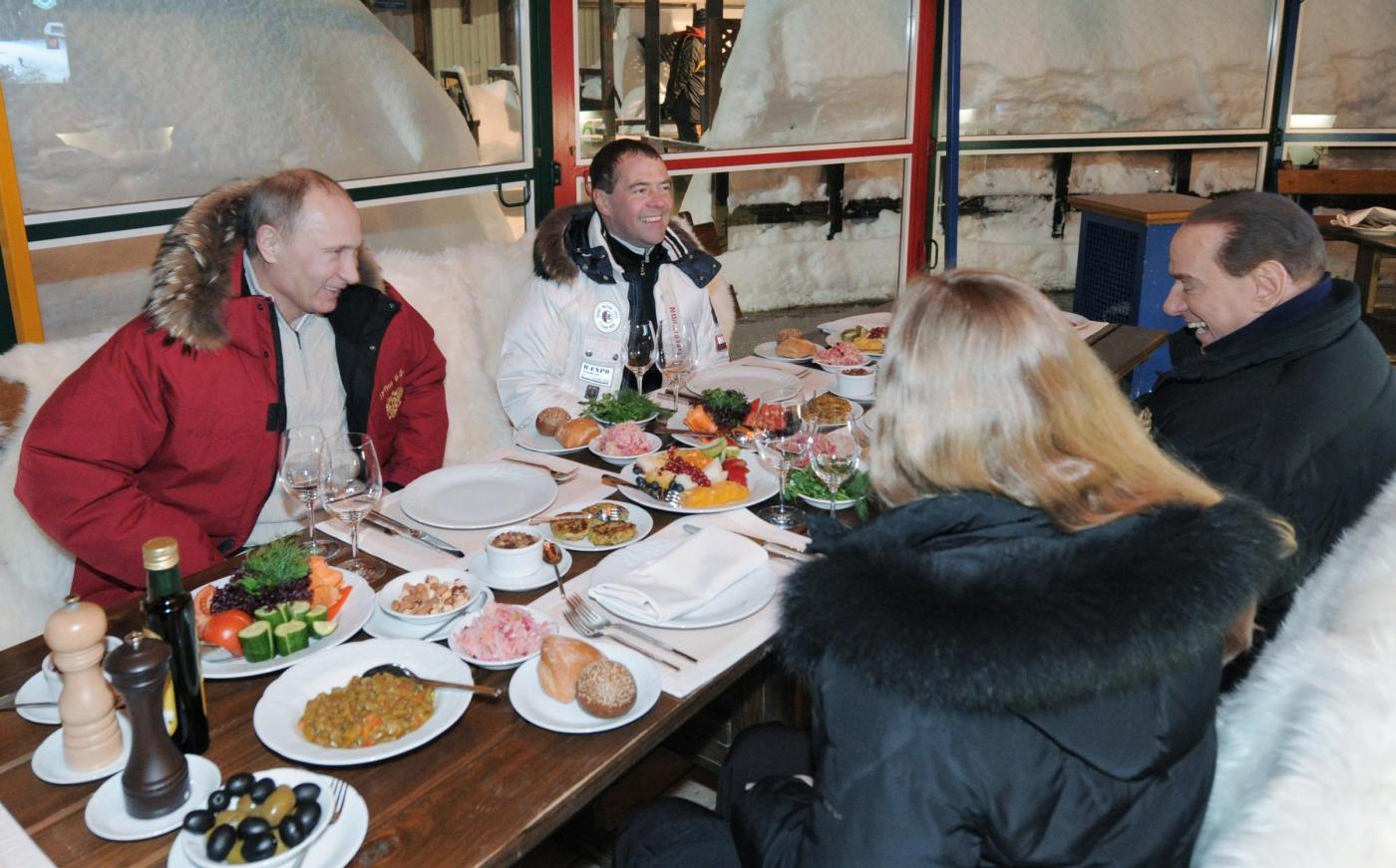 Berlusconi, visibilmente rilassato, ha ricambiato affettuosamente l’accoglienza di Medvedev, mentre Putin sorrideva. L’ospite italiano si è poi seduto a tavola con i due leader russi, in una caffè di alta montagna, sponsorizzato da Gazprom. Poltrone in pelo bianco, ampie vetrate e tavolata alla russa, con una serie di assaggi a base di verdure, frutta, gamberetti e olive.