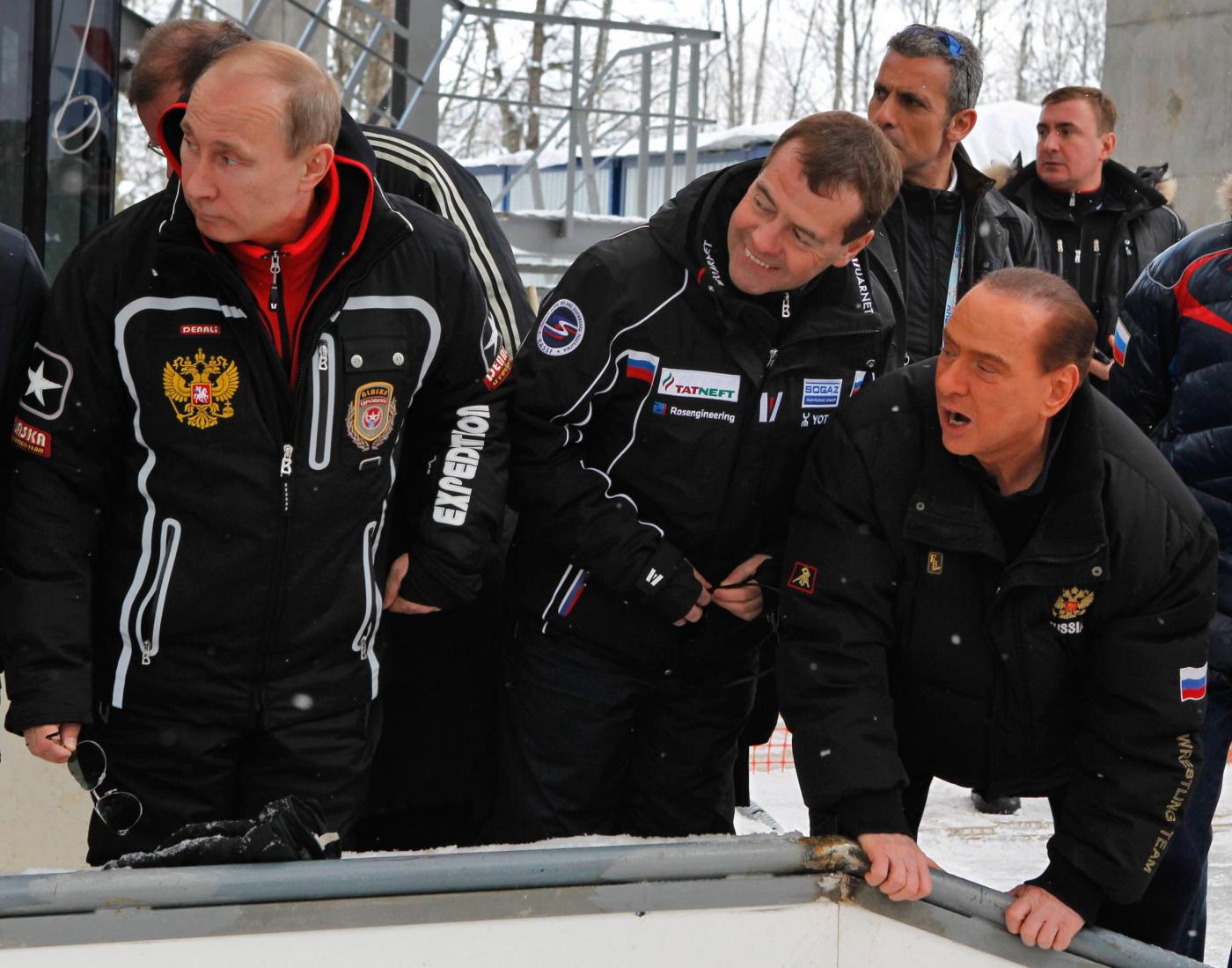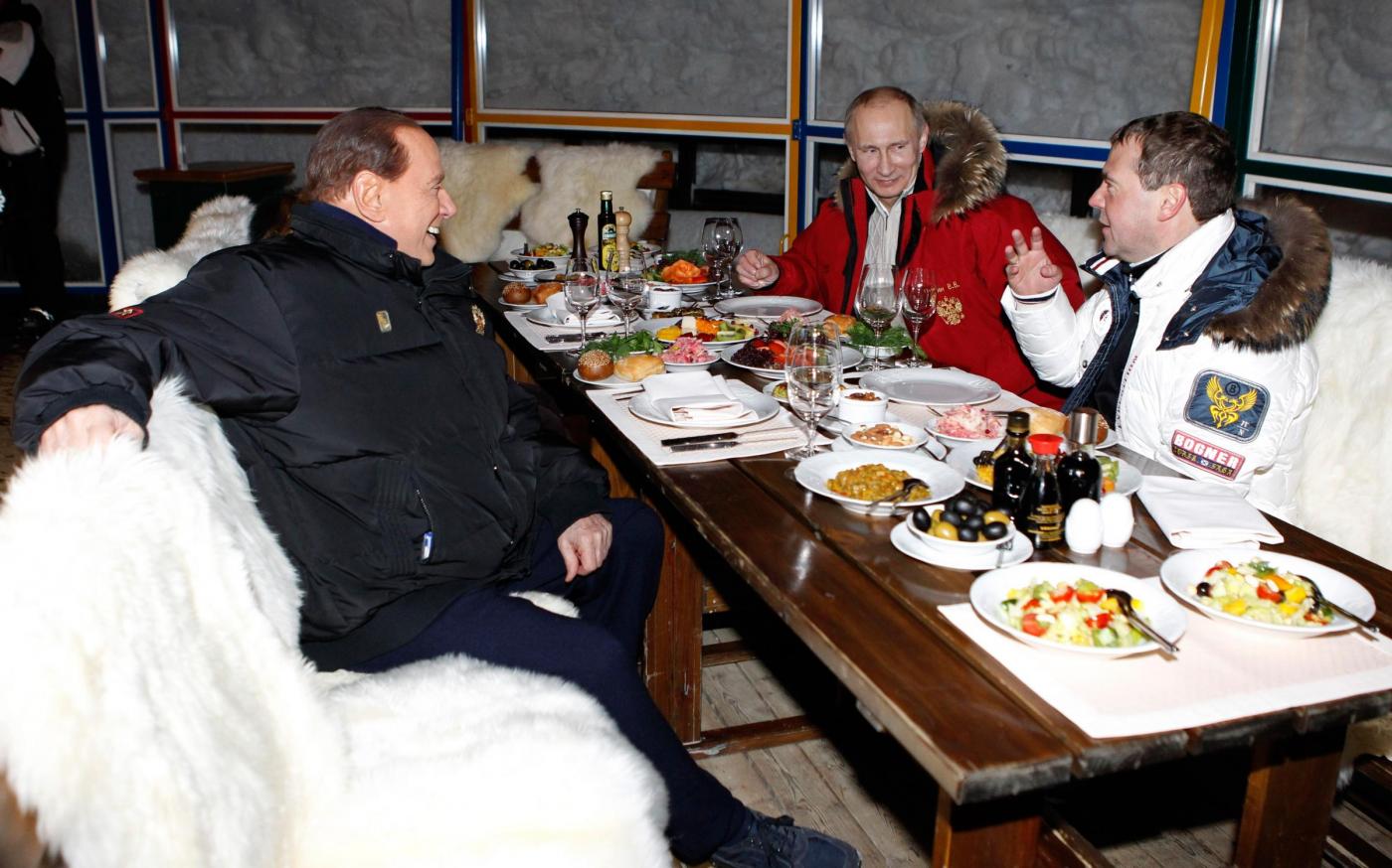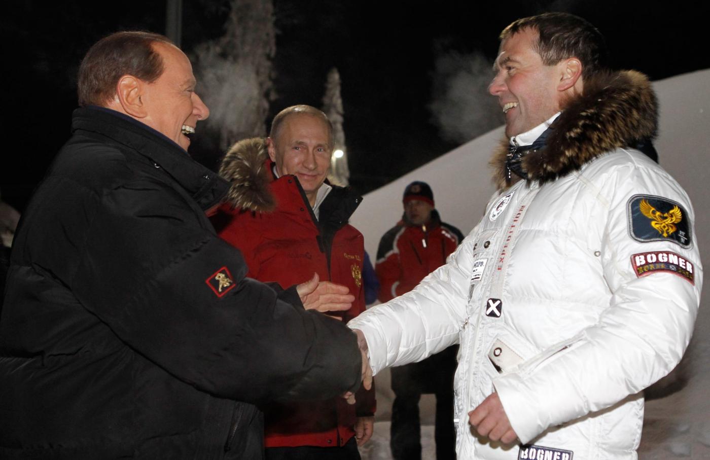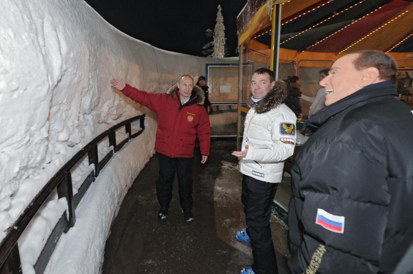 I tre avevano una giacca a vento con il simbolo russo dell’aquila bicipite: rossa quella di Putin, nera quella di Berlusconi e bianca quella di Medvedev, l’unico poi a indossare un colbacco di pelo. Il trio è uscito sotto la neve da una tensostruttura gialla con la scritta Gazprom. Berlusconi, Putin e Medvedev hanno poi cenato insieme in un caffé della località sciistica.