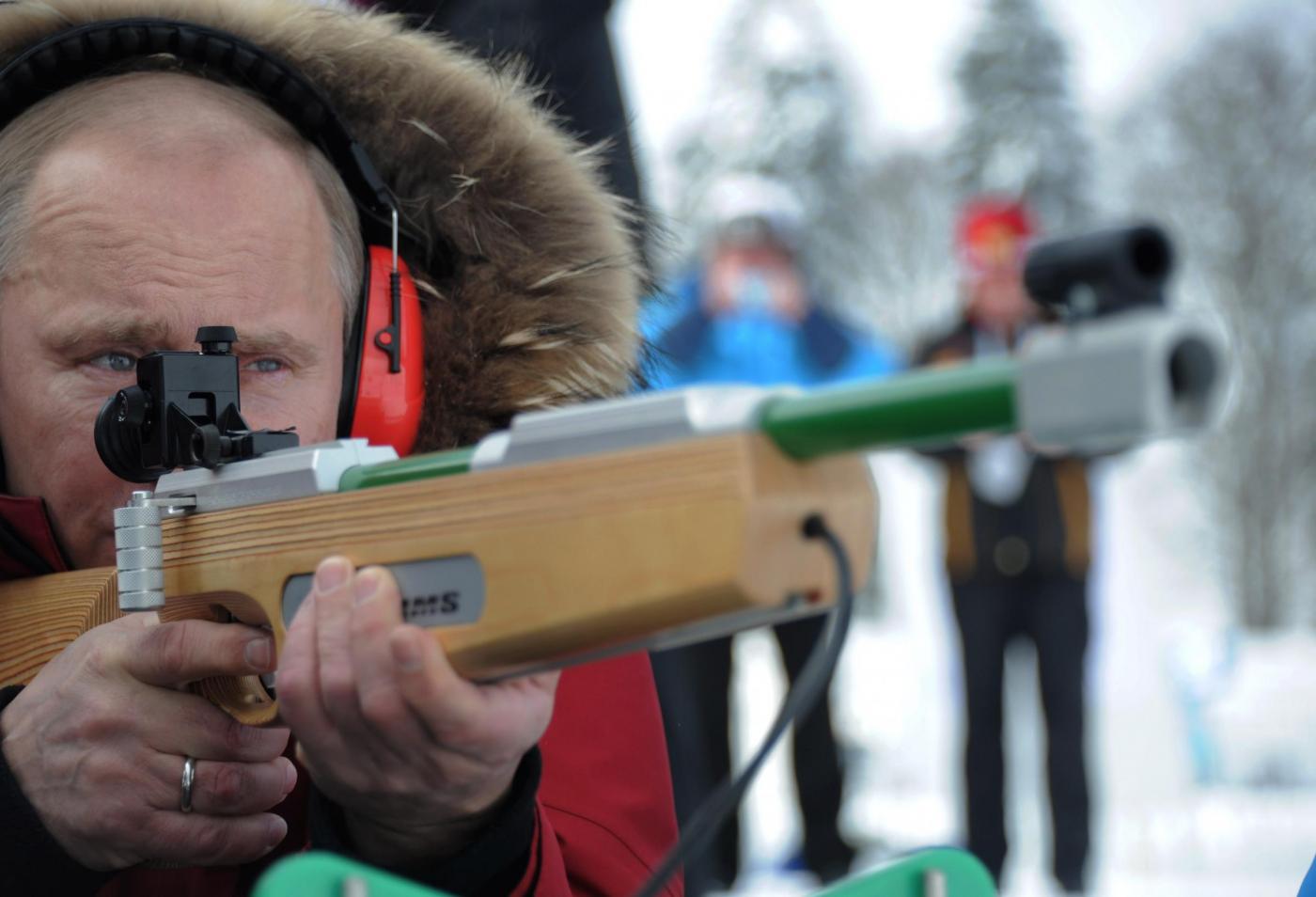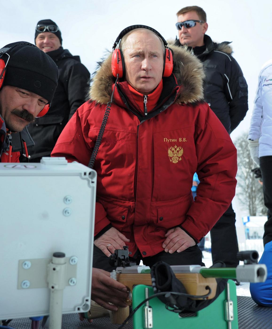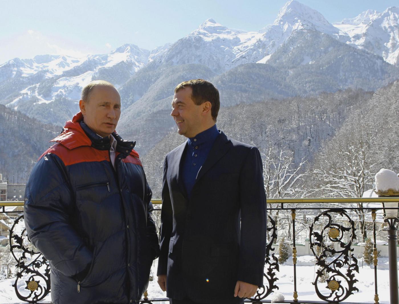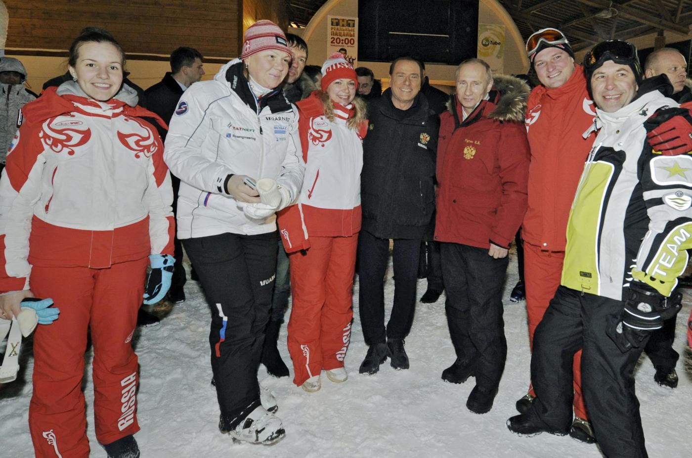 I tre avevano una giacca a vento con il simbolo russo dell’aquila bicipite: rossa quella di Putin, nera quella di Berlusconi e bianca quella di Medvedev, l’unico poi a indossare un colbacco di pelo. Il trio è uscito sotto la neve da una tensostruttura gialla con la scritta Gazprom. Berlusconi, Putin e Medvedev hanno poi cenato insieme in un caffé della località sciistica.