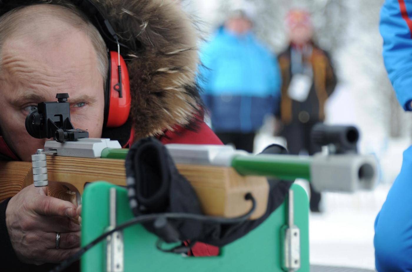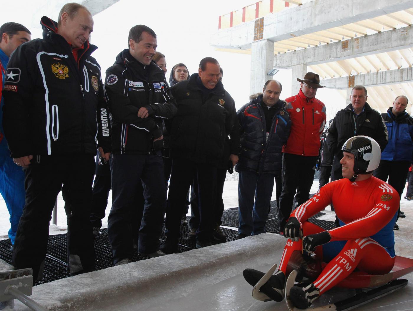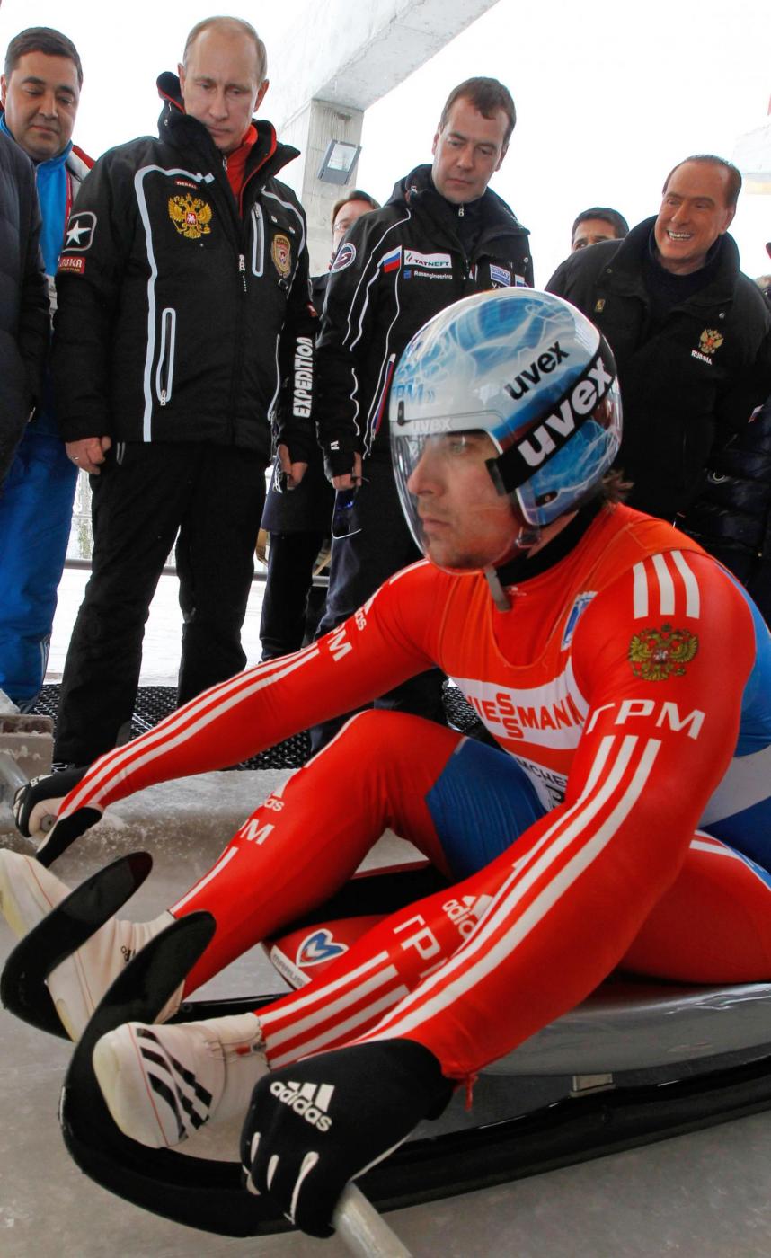 foto LaPresse09-03-2012 Krasnaya Polyana EsteroVladimir Putin e Silvio Berlusconi agli impianti sciistici di Krasnaja Poliananella foto: Vladimir Putin ,Dmitry Medvedev , Silvio Berlusconi durante gli allenamenti della squadra russa di slittino