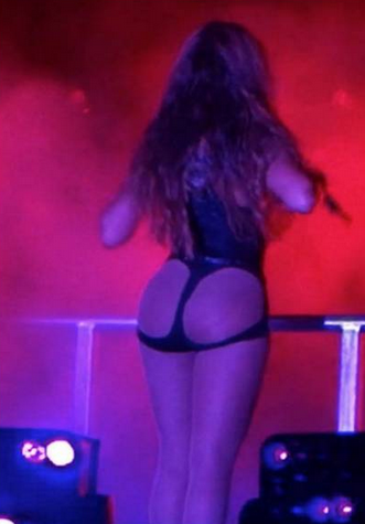 In particolare un body firmato Versace con “passamontagna” di paillettes che lasciava le terga in trasparenza…il marito Jay Z canta sul palco con lei e non sembra affatto contrariato. (Foto Lapresse).