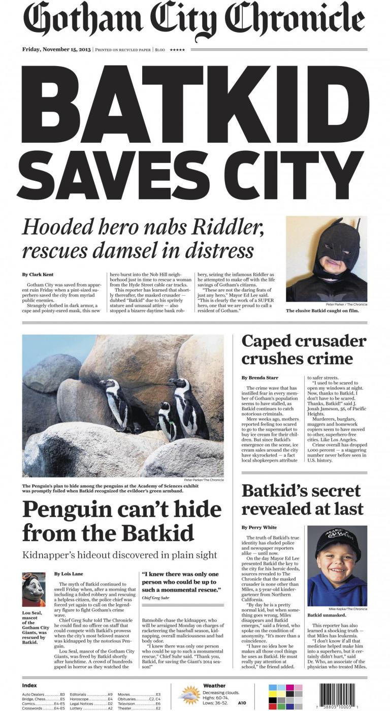 Il bimbo, malato di leucemia da quando ha 18 mesi, ha visto esaudito il suo desiderio di diventare un supereroe grazie alla A-Wish Foundation e alla sua città. Miles, indossato il bat-costume, ha vissuto una giornata di avventure straordinarie: ha salvato una damigella in pericolo, ha catturato l’Enigmista durante una rapina in banca e ha bloccato il rapimento di una persona da parte del famigerato Pinguino.