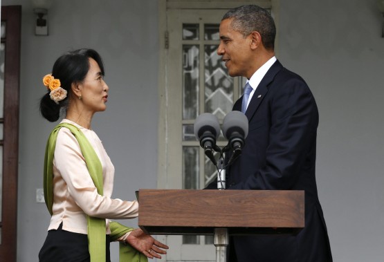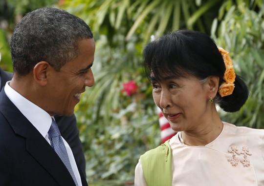 epa03477525 US President Barack Obama (R) and Myanmar opposition leader Aung San Suu Kyi, thank each other after they delivered statements expressing hope for Myanmar's further progress after their meeting at her house, in Yangon, Myanmar, 19 November 2012. Obama is the first US president to visit Myanmar and comes as it moves towards greater liberalisation and freedoms for its citizens after its first general election in two decades. EPA/BARBARA WALTON