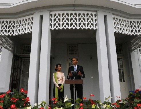 epa03477526 US President Barack Obama and Myanmar opposition leader Aung San Suu Kyi,as they deliver statements expressing hope for Myanmar's further progress from the balcony of her house during their meeting, in Yangon, Myanmar, 19 November 2012. Obama is the first US president to visit Myanmar and comes as it moves towards greater liberalisation and freedoms for its citizens after its first general election in two decades. EPA/BARBARA WALTON