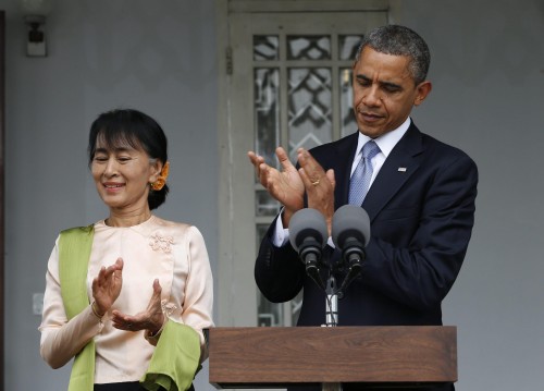 epa03477595 US President Barack Obama (R) and Myanmar opposition leader Aung San Suu Kyi clap their appreciation to US Secretary of State Hillary Clinton as they thank her for her work after their meeting at her house, in Yangon, Myanmar, 19 November 2012. Obama is the first US president to visit Myanmar and comes as it moves towards greater liberalisation and freedoms for its citizens after its first general election in two decades. EPA/BARBARA WALTON