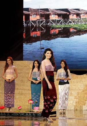 epa03894333 Moe Set Wine (Front), participates in the beauty pageant of Miss Universe Myanmar 2013 at the National Theatre in Yangon, Myanmar, 03 October 2013. Twenty young women participated in the Miss Universe Myanmar 2013 beauty contest for the first time since 1961. EPA/NYEIN CHAN NAING