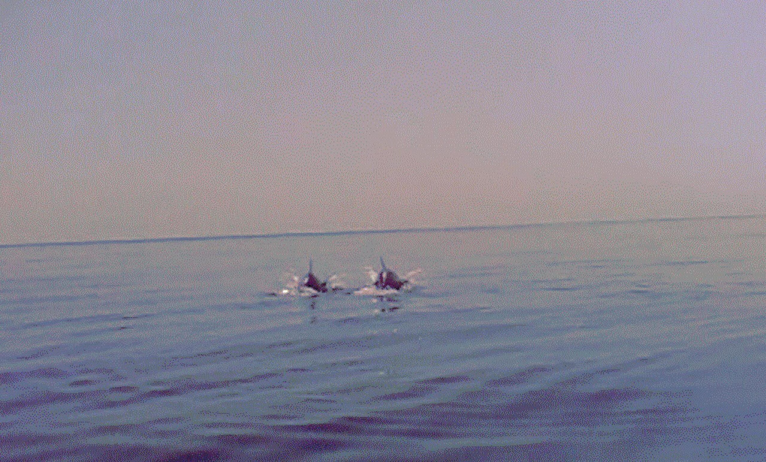 Il branco di delfini avvistato al largo del porto di Pesaro, a circa un un miglio dalla costa, dall'equipaggio di una motovedetta della Guardia costiera, 08 agosto 2013. I delfini nuotavano in direzione di Fano. ANSA/ CAPITANERIA DI PORTO DI PESARO +++ HO - NO SALES - EDITORIAL USE ONLY +++