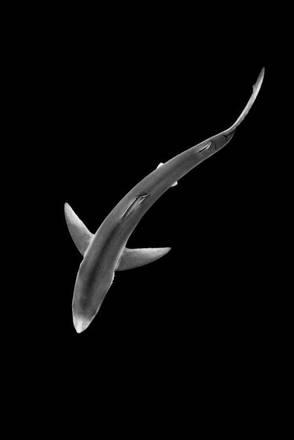 Blue on Black, vincitore nella categoria Natura britannica in bianco e nero. Foto di Alexander MustardThe sinuous shape of a blue shark (Prionace glauca) as it cruises beneath the surface of the English Channel. Penzance, Cornwall, England, British Isles. North East Atlantic Ocean. Chum (smelly, minced dead fish) was used to attract the sharks. Slight canvas expansion in Photoshop to enhance composition.