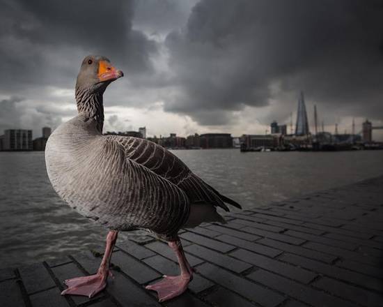 The Tourist, vincitore del concorso British Wildlife Photography Awards. Foto di Lee AcasteA bit of a random shot from me, but the opportunity was too good to pass up when I passed this Greylag Goose stood on the river wall at Wapping yesterday. He was very accommodating, happily standing there whilst I fumbled around with the manual focus on my lens, and even managed to get some handheld flash out.