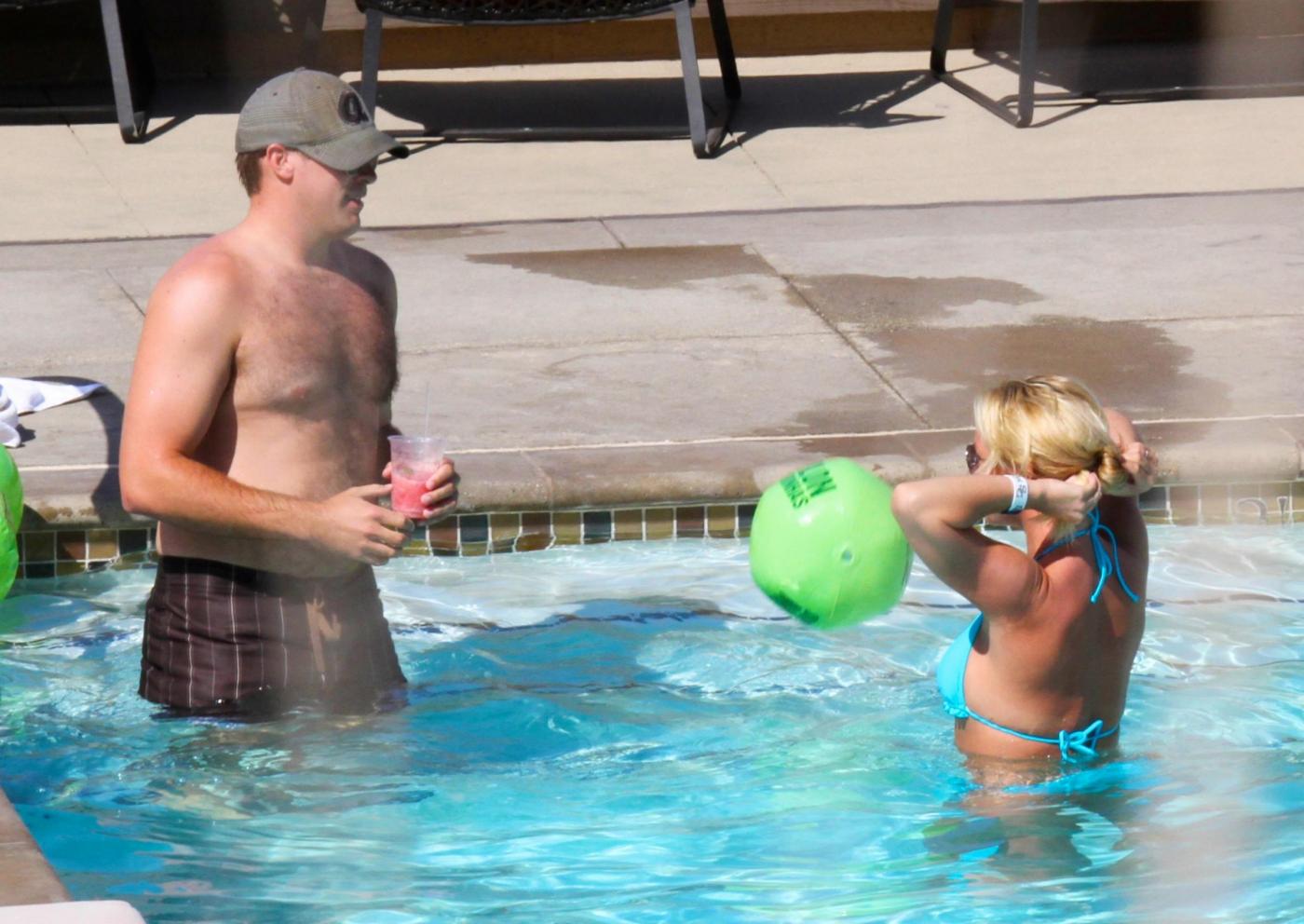 La coppia di piccioncini, si gode insieme ricche sessioni di relax in piscina e passeggiate romantiche. Britney mette in risalto il suo percing all’ombelico grazie al bikini celeste che indossa.