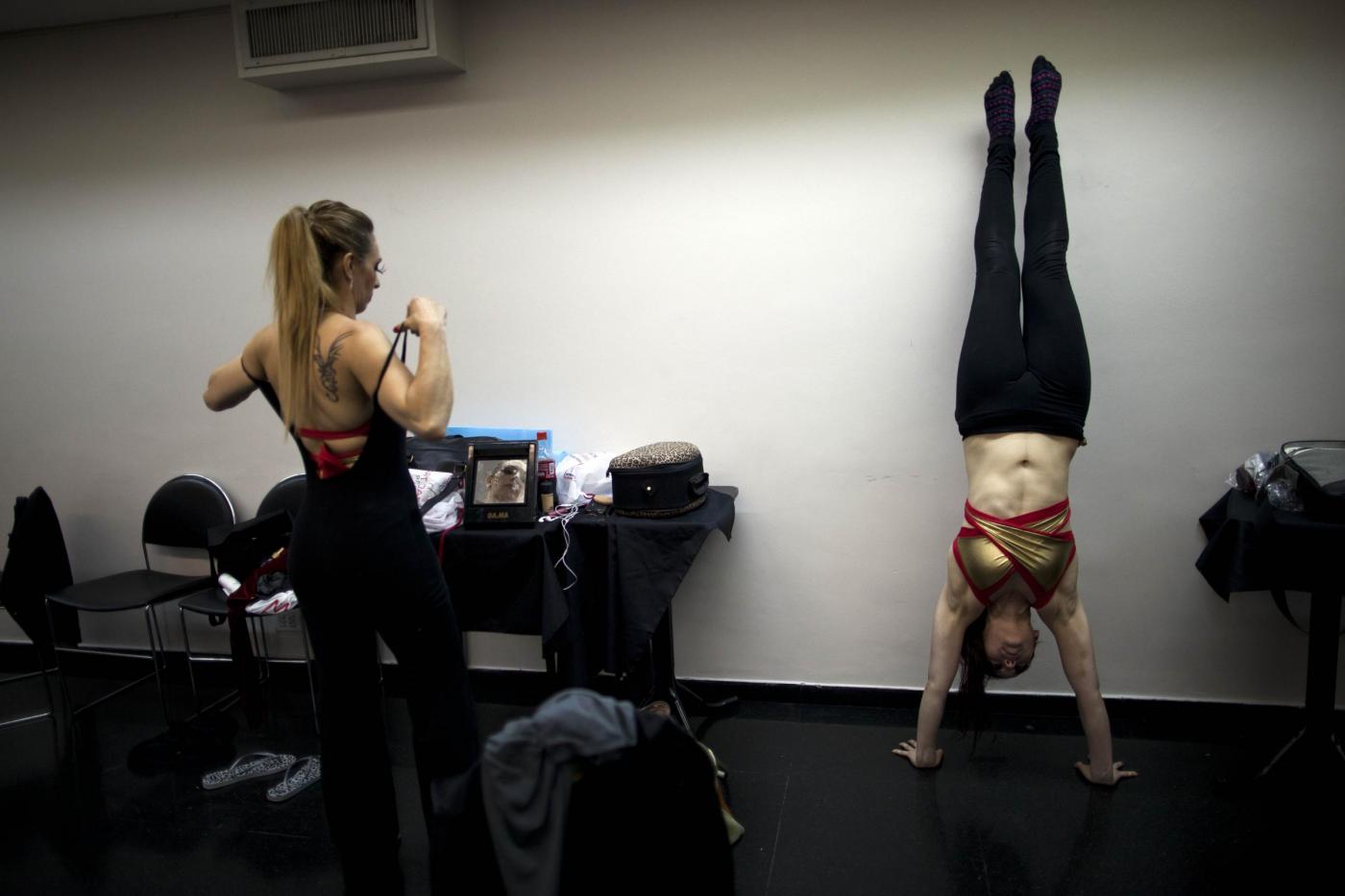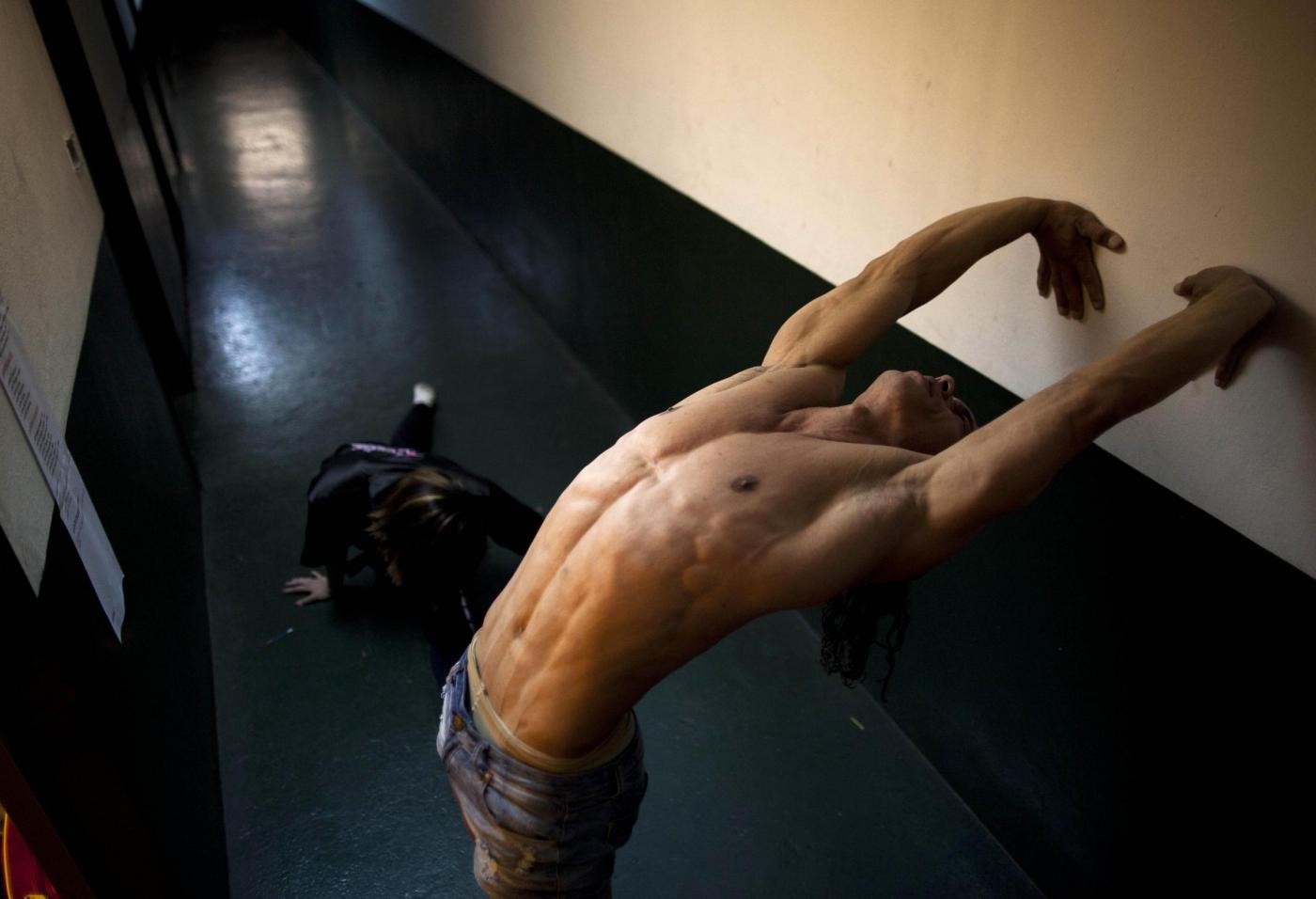 Pole dancer Carlos Franca, of Brazil, stretches in backstage before performing in the South American Male category of the Miss Pole Dance South America 2012 competition in Buenos Aires, Argentina, Monday, Nov. 26, 2012. LaPresse27-11-2012 Buenos AiresEsteriArgentina, campionato di Miss Pole Dance Sud America 2012