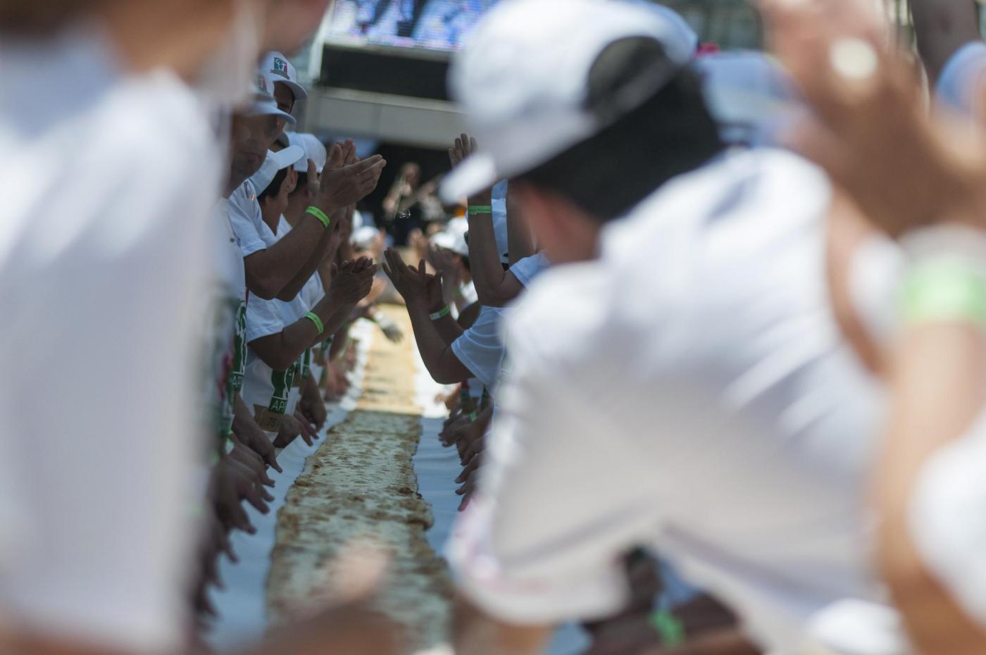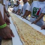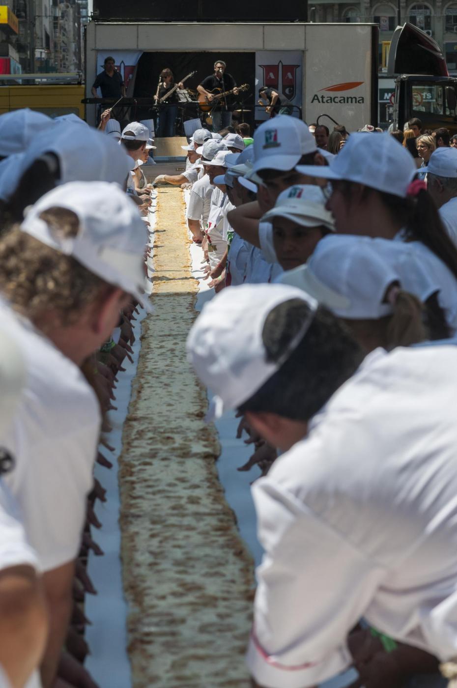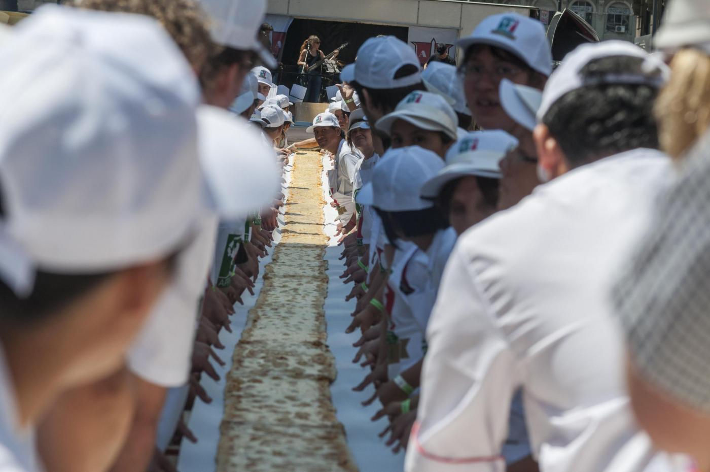 La pizza più lunga mai cucinata in città è stata preparata per beneficenza, esattamente per promuovere una raccolta fondi per l’associazione Asdra, l’associazione che in Argentina si occupa della Sindrome di Down (foto Ap/LaPresse)