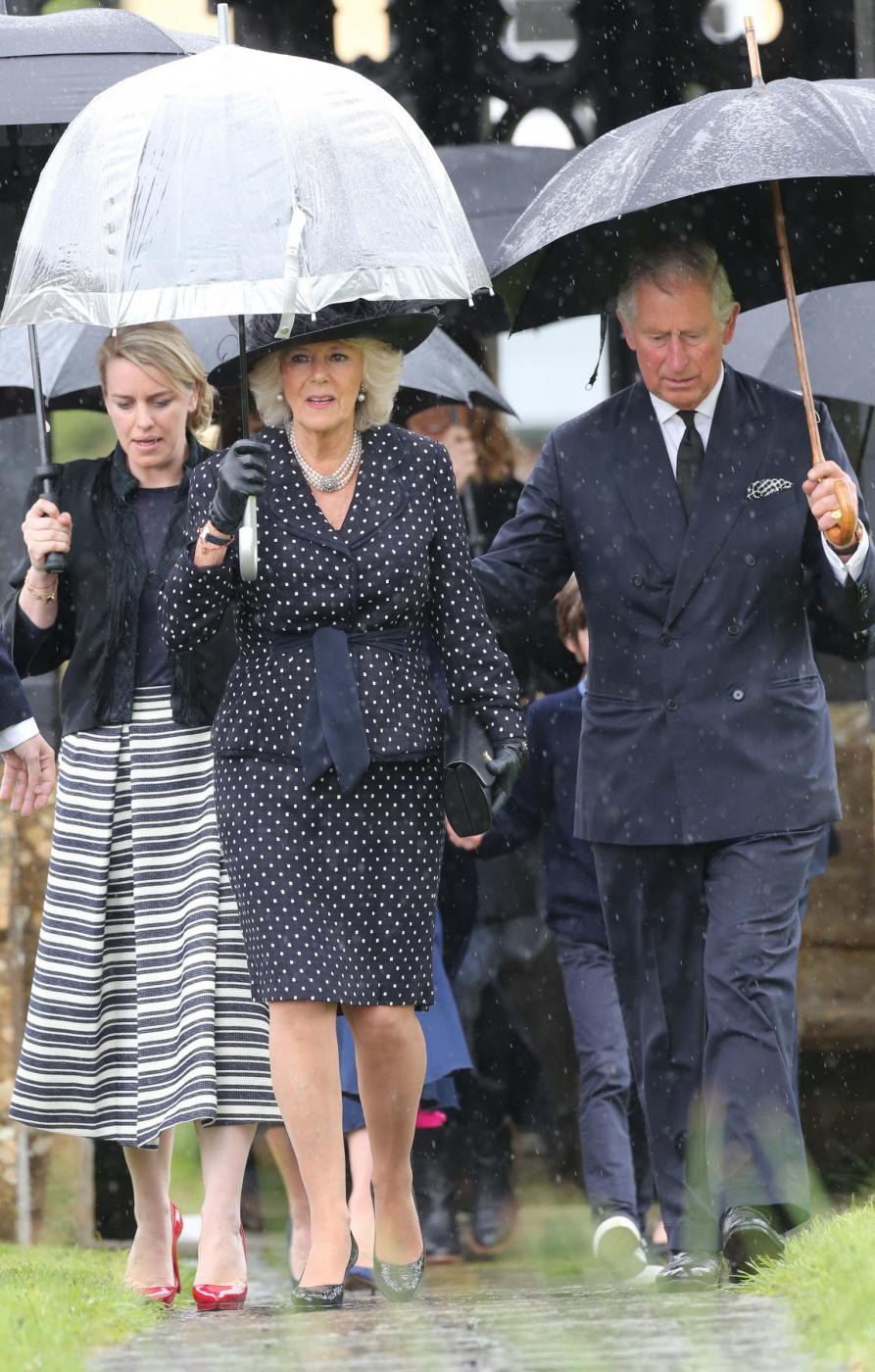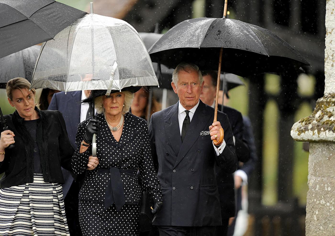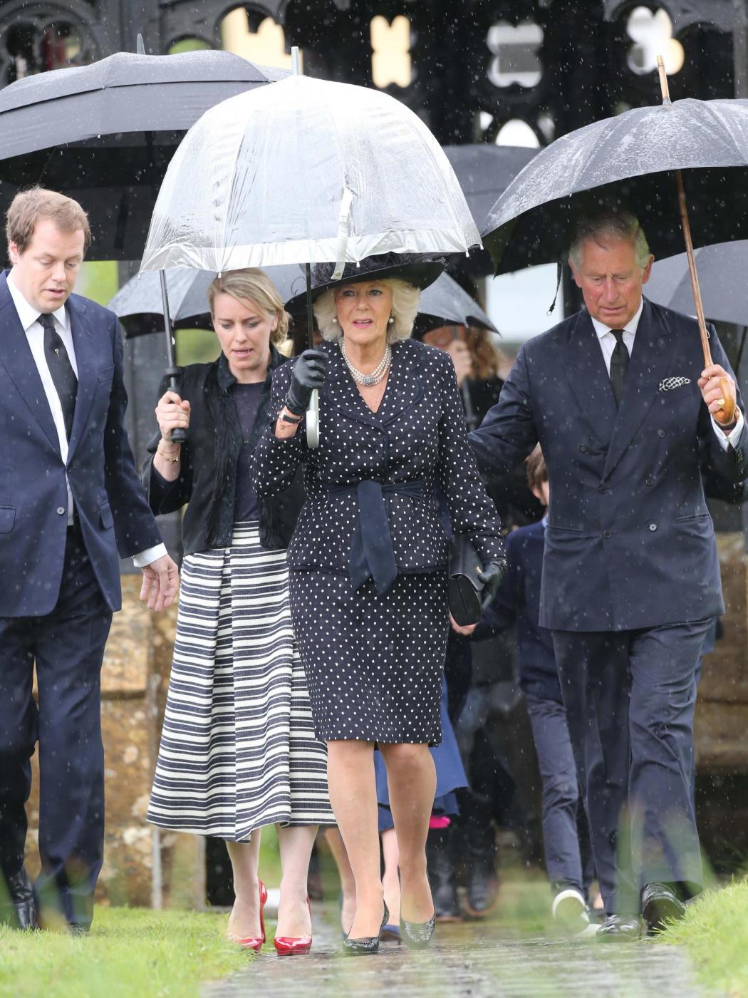 Britain's Prince Charles, right, and Camilla, Duchess of Cornwall, center, leave the funeral of Mark Shand, the brother of the Duchess of Cornwall, at Holy Trinity Church in Stourpaine, Dorset, Thursday May 1, 2014. Conservationist and travel writer Mr Shand died unexpectedly last week after falling and hitting his head in New York. (AP Photo/Andrew Matthews, PA Wire) UNITED KINGDOM OUT - NO SALES - NO ARCHIVE