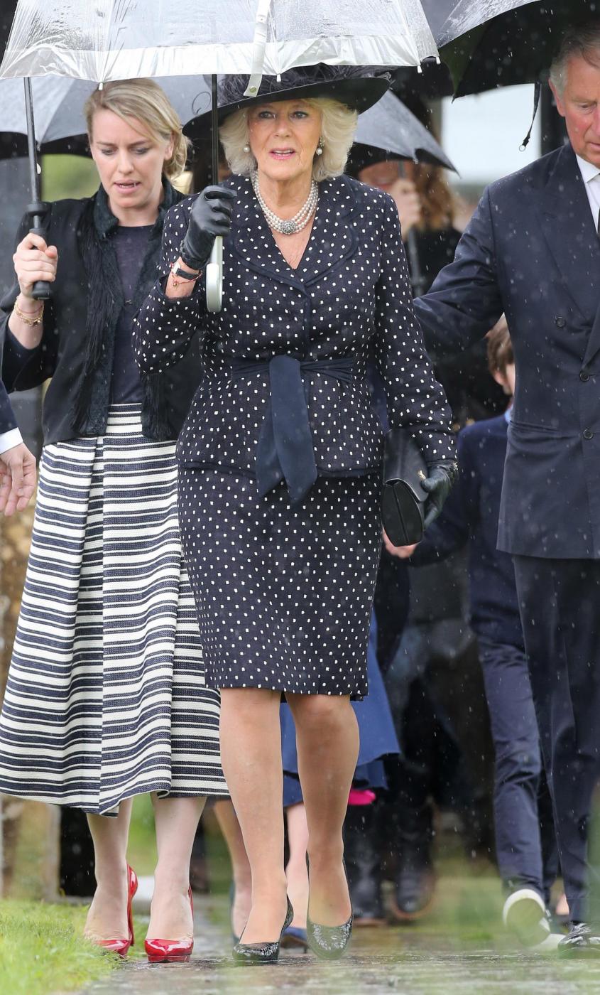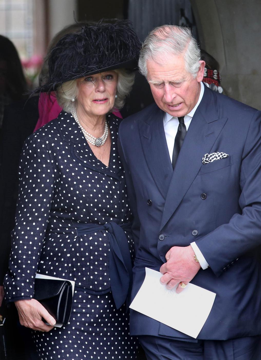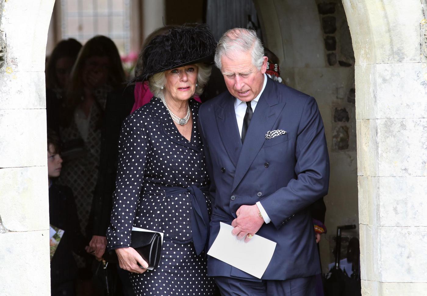 Britain's Prince Charles, right, and Camilla, Duchess of Cornwall, center, leave the funeral of Mark Shand, the brother of the Duchess of Cornwall, at Holy Trinity Church in Stourpaine, Dorset, Thursday May 1, 2014. Conservationist and travel writer Mr Shand died unexpectedly last week after falling and hitting his head in New York. (AP Photo/Andrew Matthews, PA Wire) UNITED KINGDOM OUT - NO SALES - NO ARCHIVE