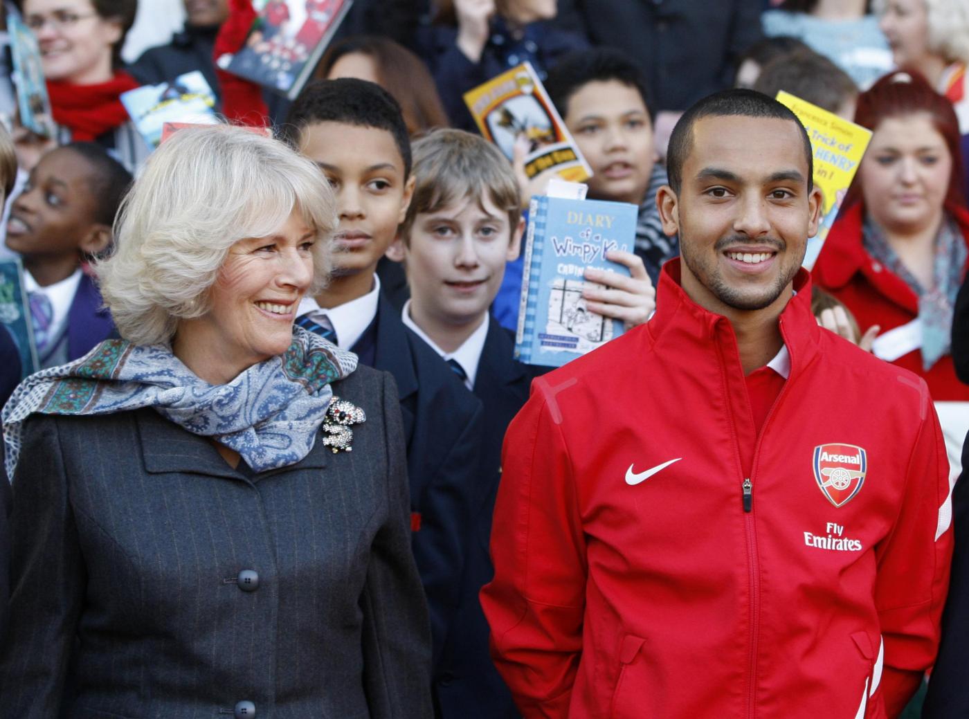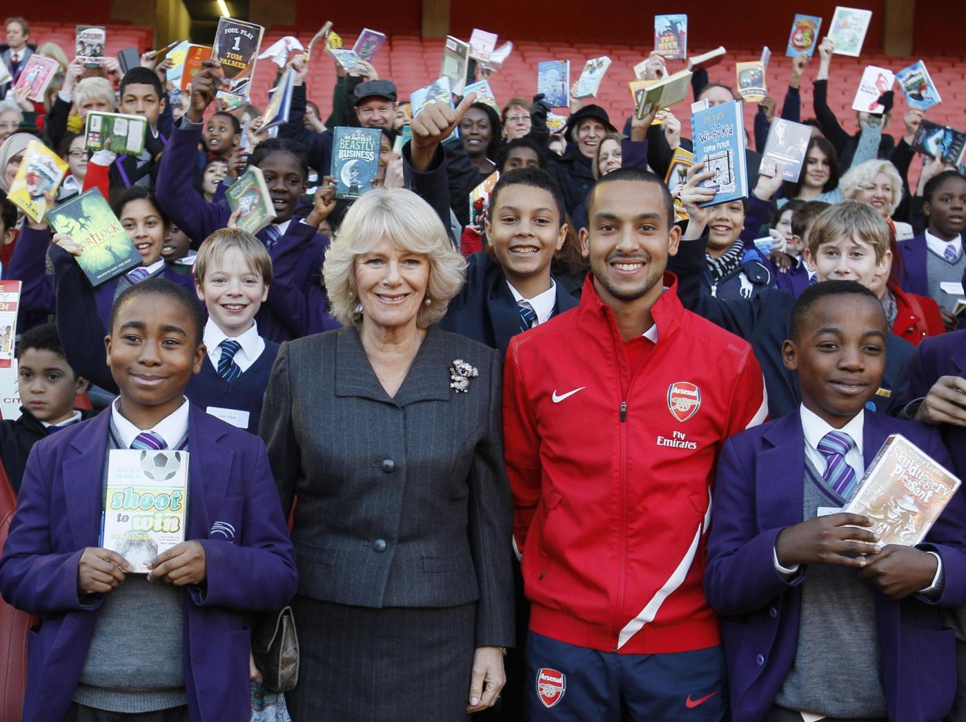 Britain's Camilla, Duchess of Cornwall and Arsenal player Theo Walcott pose for a photograph with local school children and their books at the Emirates Stadium in London, Thursday, Jan. 26, 2012. The Duchess of Cornwall, Patron of the National Literacy Trust launched the 2012 National Literacy Trust 'Premier League Reading Stars' at the stadium on Thursday. (AP Photo/Kirsty Wigglesworth, pool)
