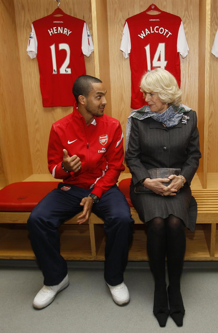LAPRESSEBritain's Camilla, Duchess of Cornwall sits in the Arsenal dressing room with Arsenal player Theo Walcott at the Emirates Stadium in London, Thursday, Jan. 26, 2012. The Duchess of Cornwall, Patron of the National Literacy Trust launched the 2012 National Literacy Trust 'Premier League Reading Stars' at the stadium on Thursday.