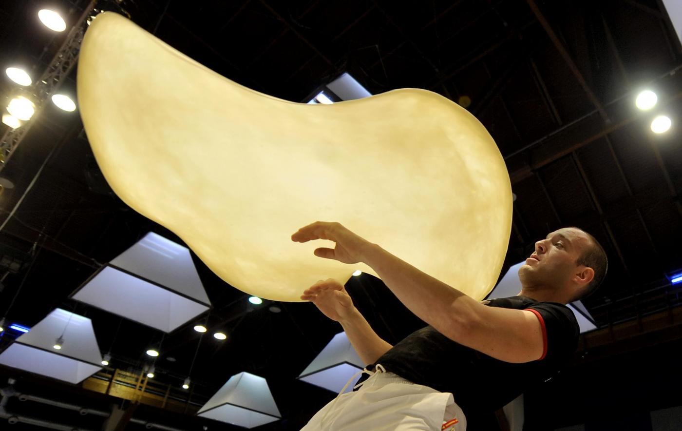 Antony Martos Del Arbol, of Spain, performs with his dough during the freestyle event, part of the Pizza World Championships, in Parma, northern Italy, Wednesday, April 9, 2014. The 23th edition of the championships run from April 7 to April 9. (AP Photo/Marco Vasini)