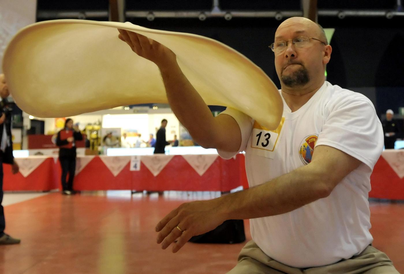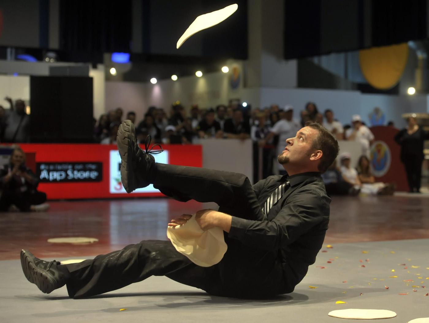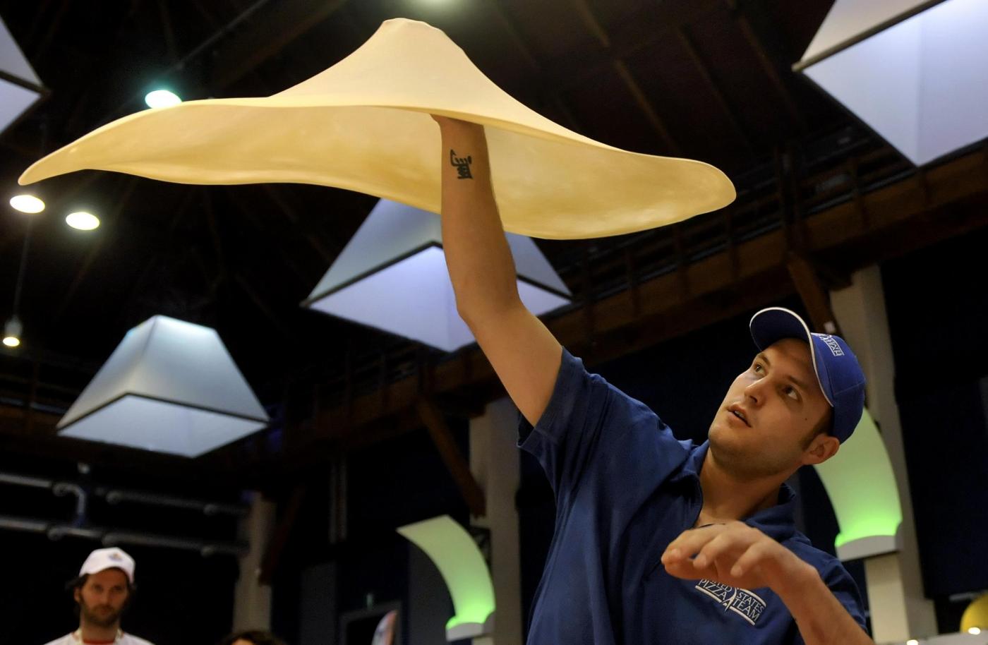 Randy Hueffmeier, of the United States, performs with his dough during the freestyle event, part of the Pizza World Championships, in Parma, northern Italy, Wednesday, April 9, 2014. The 23th edition of the championships run from April 7 to April 9. (AP Photo/Marco Vasini)