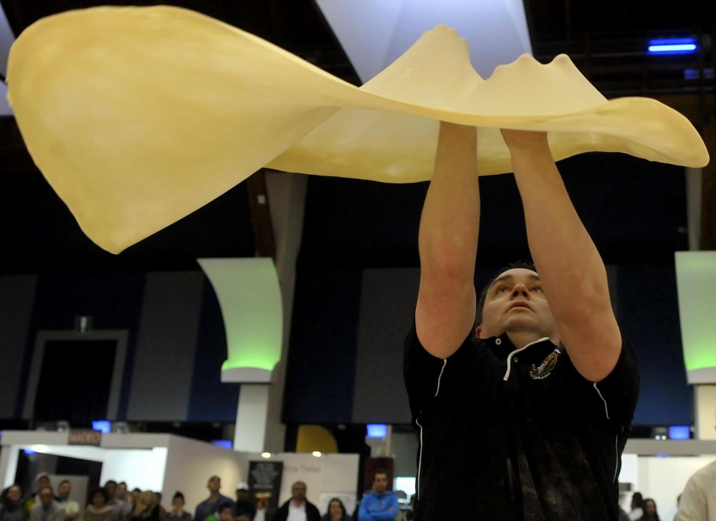 Antonio Fiorillo performs with his dough during the acrobatic pizza event, part of the Pizza World Championships, in Parma, northern Italy, Wednesday, April 9, 2014. The 23th edition of the championships run from April 7 to April 9. (AP Photo/Marco Vasini)