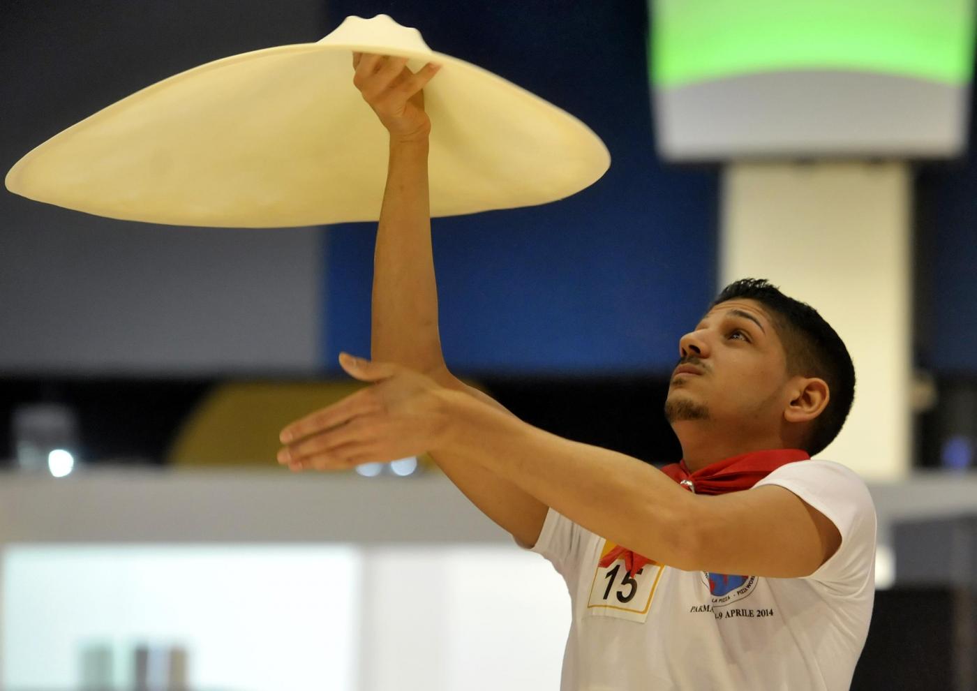 Lewis Botros George Nazir, of Egypt, performs with his dough during the freestyle event, part of the Pizza World Championships, in Parma, northern Italy, Wednesday, April 9, 2014. The 23th edition of the championships run from April 7 to April 9. (AP Photo/Marco Vasini)