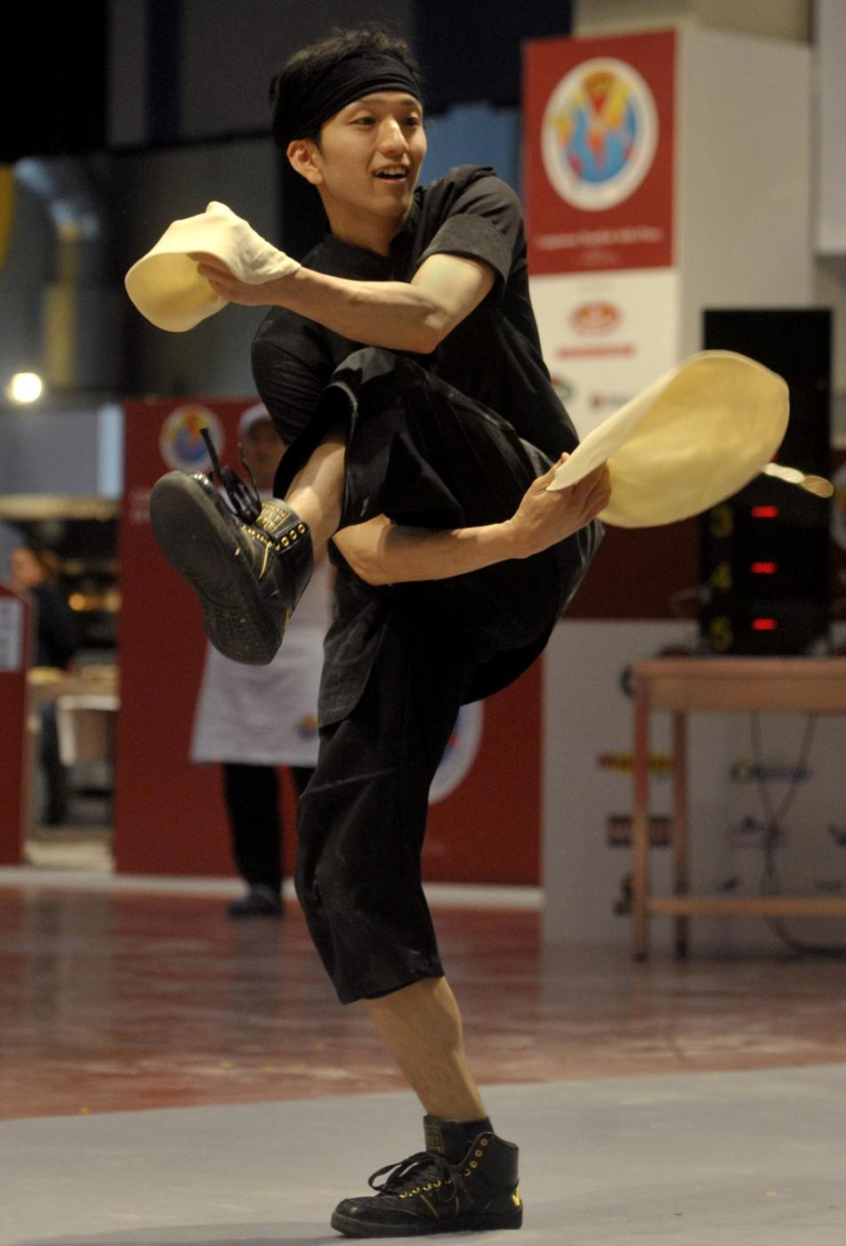 Takumi Tachikawa, of Japan, performs with his dough during the acrobatic pizza event, part of the Pizza World Championships, in Parma, northern Italy, Wednesday, April 9, 2014. The 23th edition of the championships run from April 7 to April 9. (AP Photo/Marco Vasini)