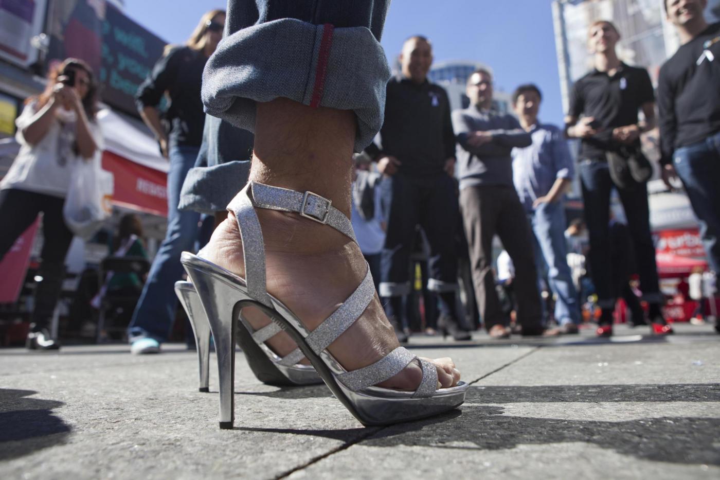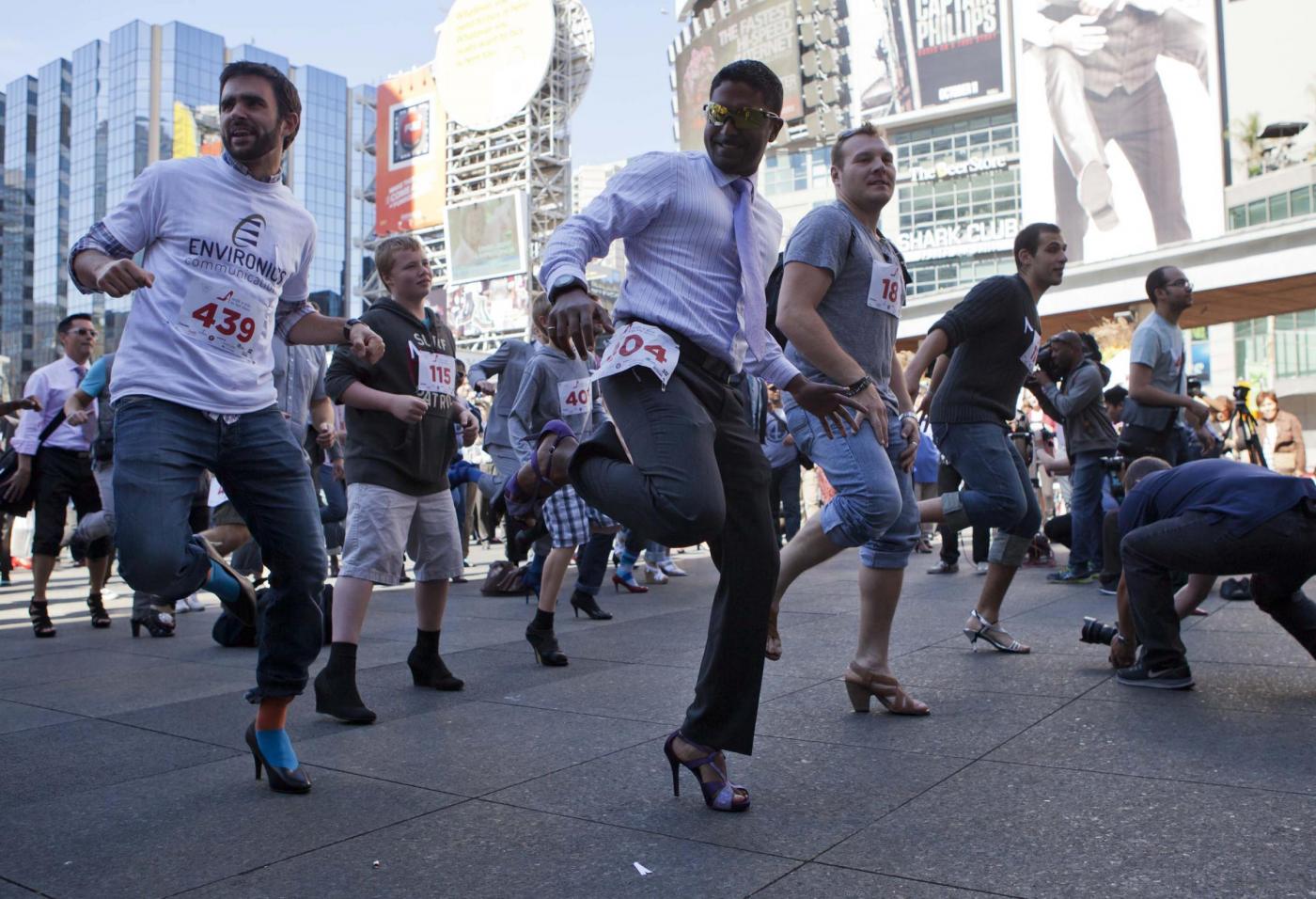 Participants wearing high-heel shoes pose for photos during the 5th annual Walk a Mile in Her Shoes event at Yonge-Dundas Square in Toronto, Canada, Sept. 26, 2013. Kicked off on Thursday, the annual event initiated by the White Ribbon Campaign (WRC) attracted more than 400 participants to walk one mile in women's shoes to raise awareness about ending violence against women. Xinhua/Zou Zheng Zuma PressLaPresse -- Only Italy