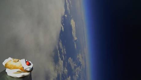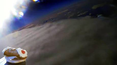 Il cannolo è stato posizionato su un pallone sonda, riempito di elio e dotato di una microcamera, che ha raggiunto quasi 30 mila metri d’altezza. Oltre al video, anche le foto sono spettacolari e divertenti (Ansa)