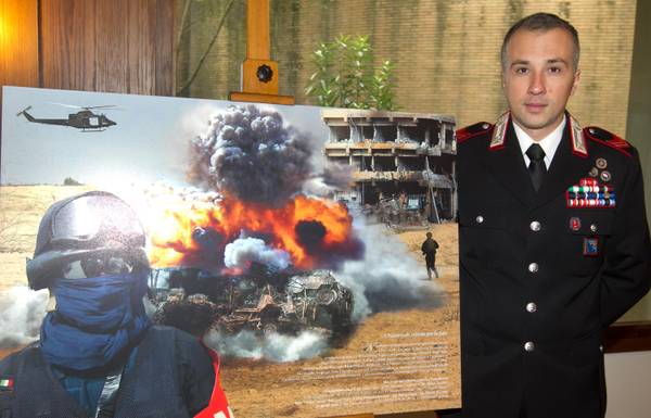 L'appuntato Mario Alberto Caldarone, reduce dell'attentato di Nassirya, posa davanti a una delle tavole del calendario dell'Arma dei Carabinieri 2014 a margine della presentazione presso la scuola ufficiali in via Aurelia a Roma, 13 dicembre 2013. ANSA/CLAUDIO PERI