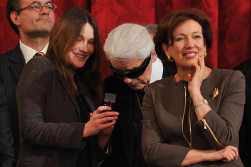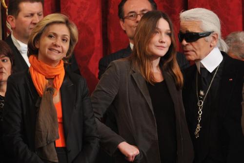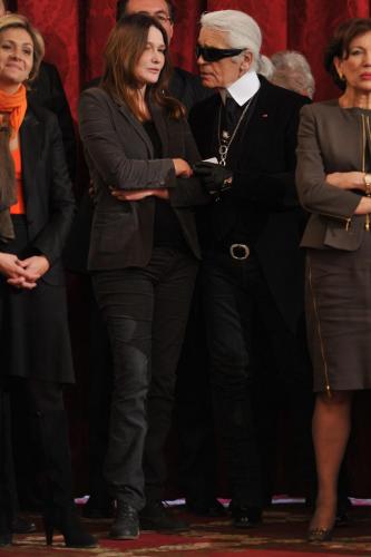 Oggi la Bruni si presenta in pubblico come si vede in foto. In una cerimonia ufficiale all’Eliseo, accanto allo stilista-guru Karl Lagerfeld, si mostra struccata, con i capelli lunghi senza un taglio preciso, con giacca e pantaloni informi di un indefinibile color fango. D’accordo la maternità, d’accordo che essere un’icona di stile non è più una priorità della signora Bruni, ma lo stile “casalinga disperata” non si addice proprio alla bella Carla. (Foto Lapresse).