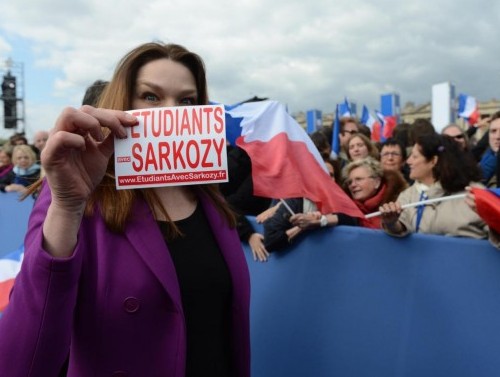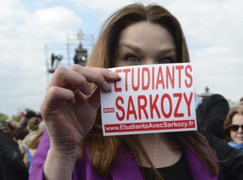 Carlà si è fatta fotografare sorridente mentre stringe mani dei fan e mostra un adesivo con la scritta “Studenti per Sarkozy”.