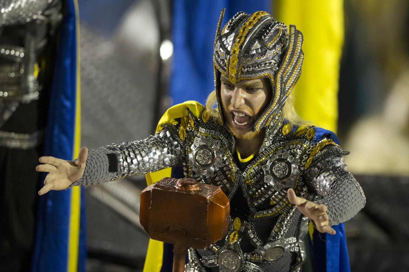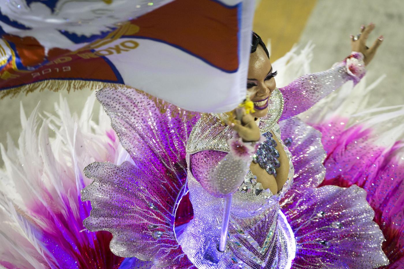 A performer from the Mocidade Independente de Padre Miguel samba school participates in the carnival celebrations at the Sambadrome in Rio de Janeiro, early Monday, Feb. 11, 2013. (AP Photo/Felipe Dana)