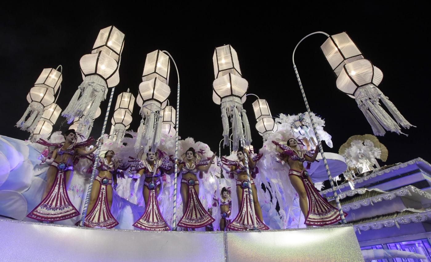 Dancers perform atop a float during Inocentes de Belford Roxo samba school parade at the Sambadrome during carnival celebrations in Rio de Janeiro, Brazil, Sunday, Feb. 10, 2013. (AP Photo/Hassan Ammar)