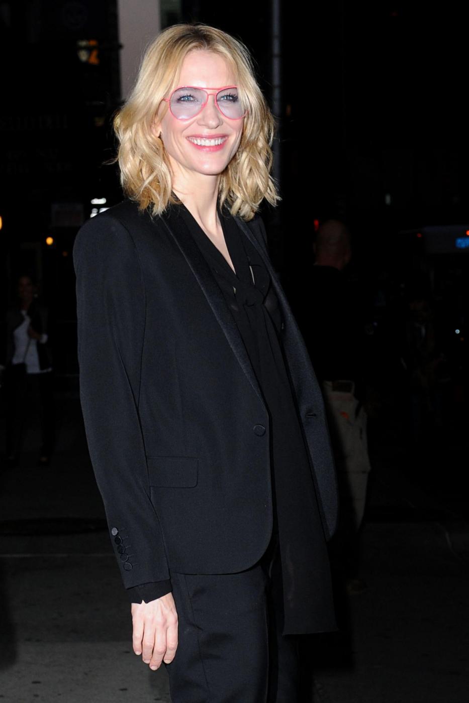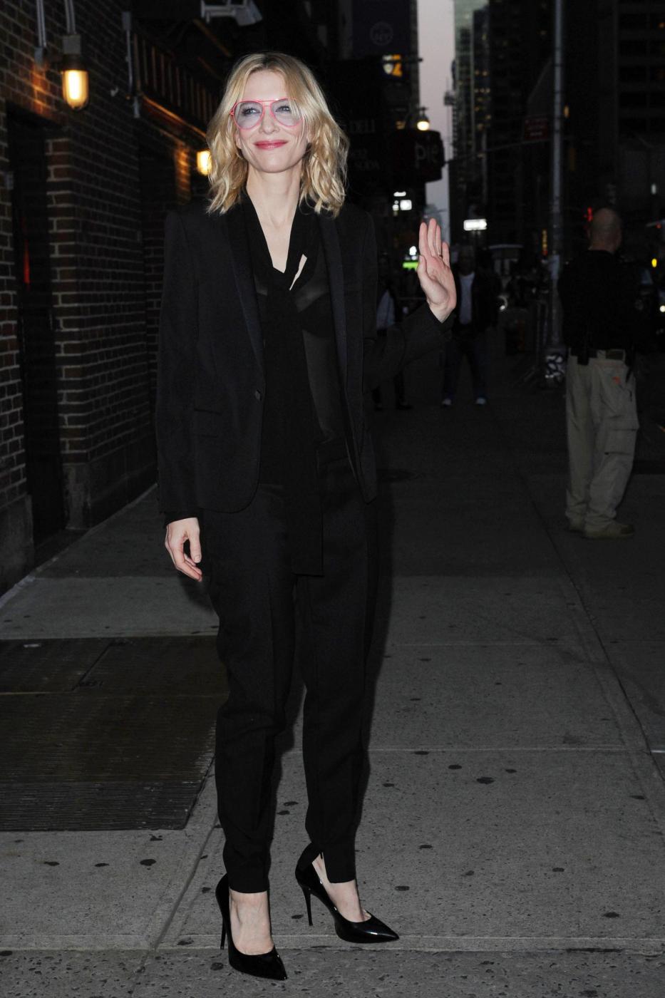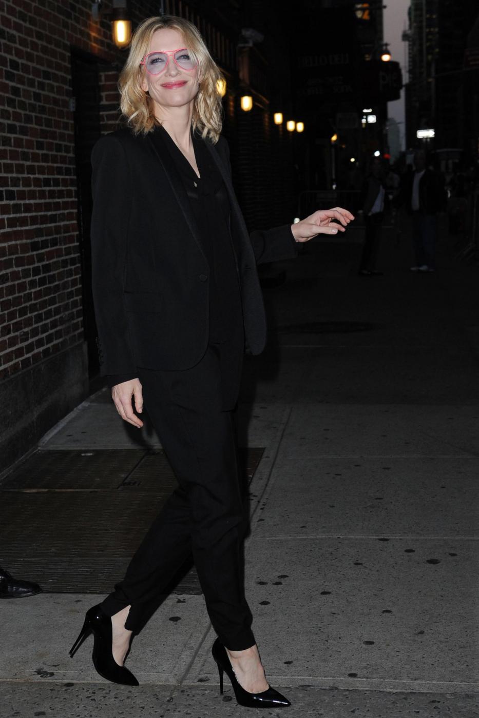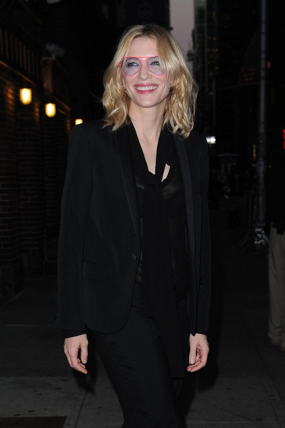 NEW YORK – Cate Blanchett ospite del Late Show, arriva con un completo nero e degli occhialoni rosa. A 46 anni, la Blanchett mostra tutta la sua sensualità e la sua eleganza che negli anni è rimasta invariata. La Blanchett recentemente ha ammesso di non essere molto brava nell’acquisto della sua biancheria intima. La sua collezione di intimo, a suo stesso dire è tutto fuorché sensuale o glamour. La Blanchett indossa infatti gli stessi capi di biancheria di quando era una ragazzina ormai completamente consumati.