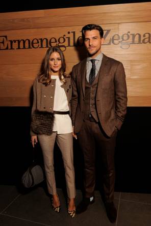 Olivia Palermo ha scelto un total look Agnoni A\I 2012 per partecipare alla sfilata Ermenegildo Zegna. Oliva ha indossato un pantalone pied de poulè a gamba dritta sui toni del marroni, una camicia in seta bianca, un golf in cashmere con intarsiato nella maglia strisce di volpe, una pochette in jersey di cashmere.