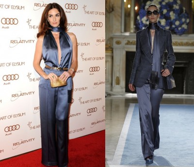 Paz Vega, in occasione della 5a edizione annuale del Art Of Elysium's Heaven Gala, tenutasi a Los Angeles, ha indossato un total look Salvatore Ferragamo. La Vega ha scelto un top in raso blu con profonda scollatura davanti e sciarpa al collo con frange di paillettes, abbinato ad un paio di pantaloni a fondo ampio dello stesso colore, e ad una cintura in metallo dorato (Collezione Resort 2012). L'attrice ha scelto una minaudière doube face in metallo oro e karung.