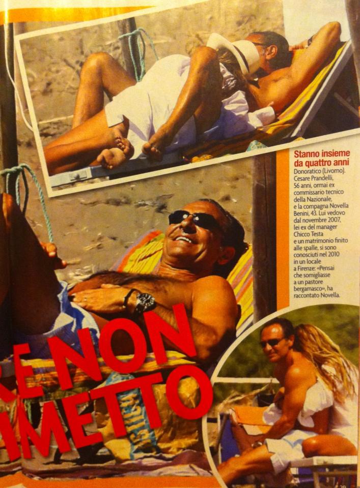 FIRENZE – L’ex ct azzurro Cesare Prandelli, reduce dalla delusione in Brasile, si consola fra le braccia della compagna Novella Benini sulle spiagge di Donoratico (Livorno). La donna l’ha seguito anche nel Paese sudamericano, così come hanno fatto altre compagne e mogli di calciatori. Berretto calato in testa, piercing al naso e abbigliamento sobrio, la bionda Novella è ben lontana dalle manie di protagonismo che caratterizzano altre wags. E’ figlia di un banchiere e discende da una famiglia nobile fiorentina.
