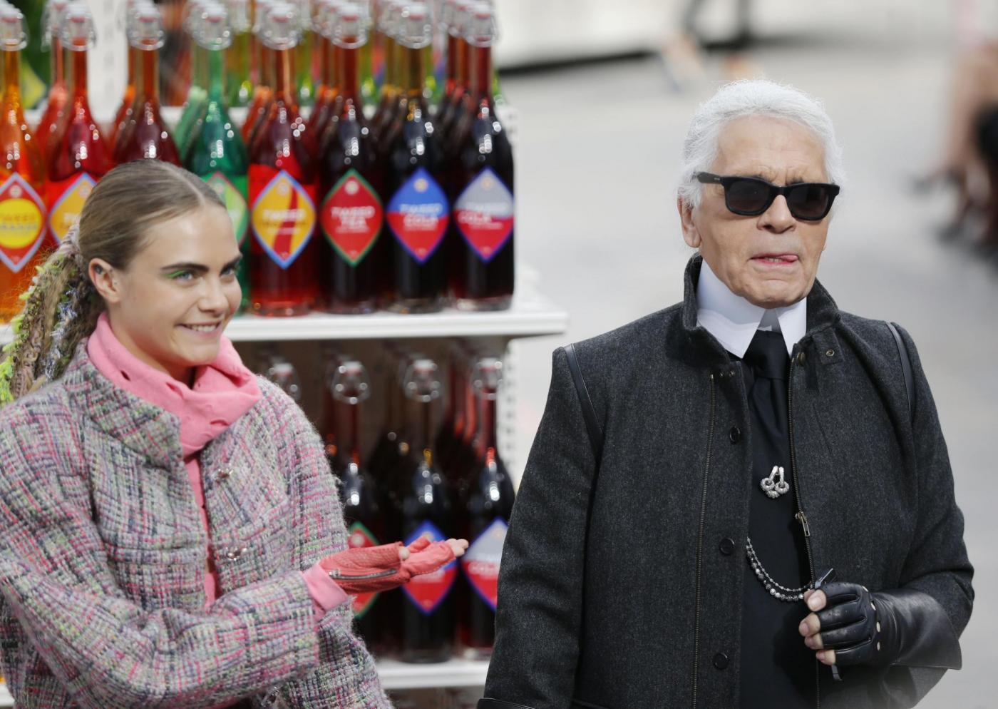 Model Cara Delevingne gestures towards German fashion designer Karl Lagerfeld after the presentation of Chanel's ready to wear fall/winter 2014-2015 fashion collection presented in Paris, Tuesday, March 4, 2014. (AP Photo/Jacques Brinon)