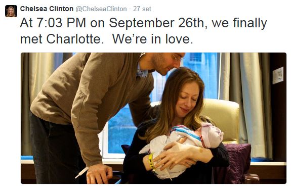 A dare la notizia della nascita è stata la stessa Chelsea con un messaggio su Twitter e Facebook: “Marc ed io siamo pieni di amore, stupore e gratitudine per la nascita di Charlotte”. La 34enne è l’unica figlia di Bill e Hillary ed è sposata dal 2010 con il banchiere Mar Mezvinsky.