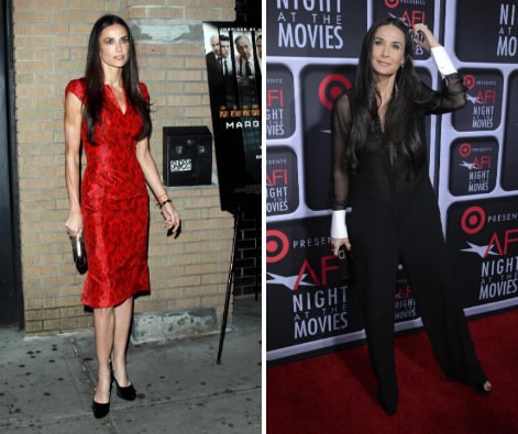 Demi Moore, a sinistra nel 2011 visibilmente magra. A destra una foto di pochi giorni fa. L'attrice ha ripreso qualche chilo che aveva perso alla fine del suo matrimonio con Ashton KutcherDemi Moore, a sinistra nel 2011 visibilmente magra. A destra una foto di pochi giorni fa. L'attrice ha ripreso qualche chilo che aveva perso alla fine del suo matrimonio con Ashton Kutcher